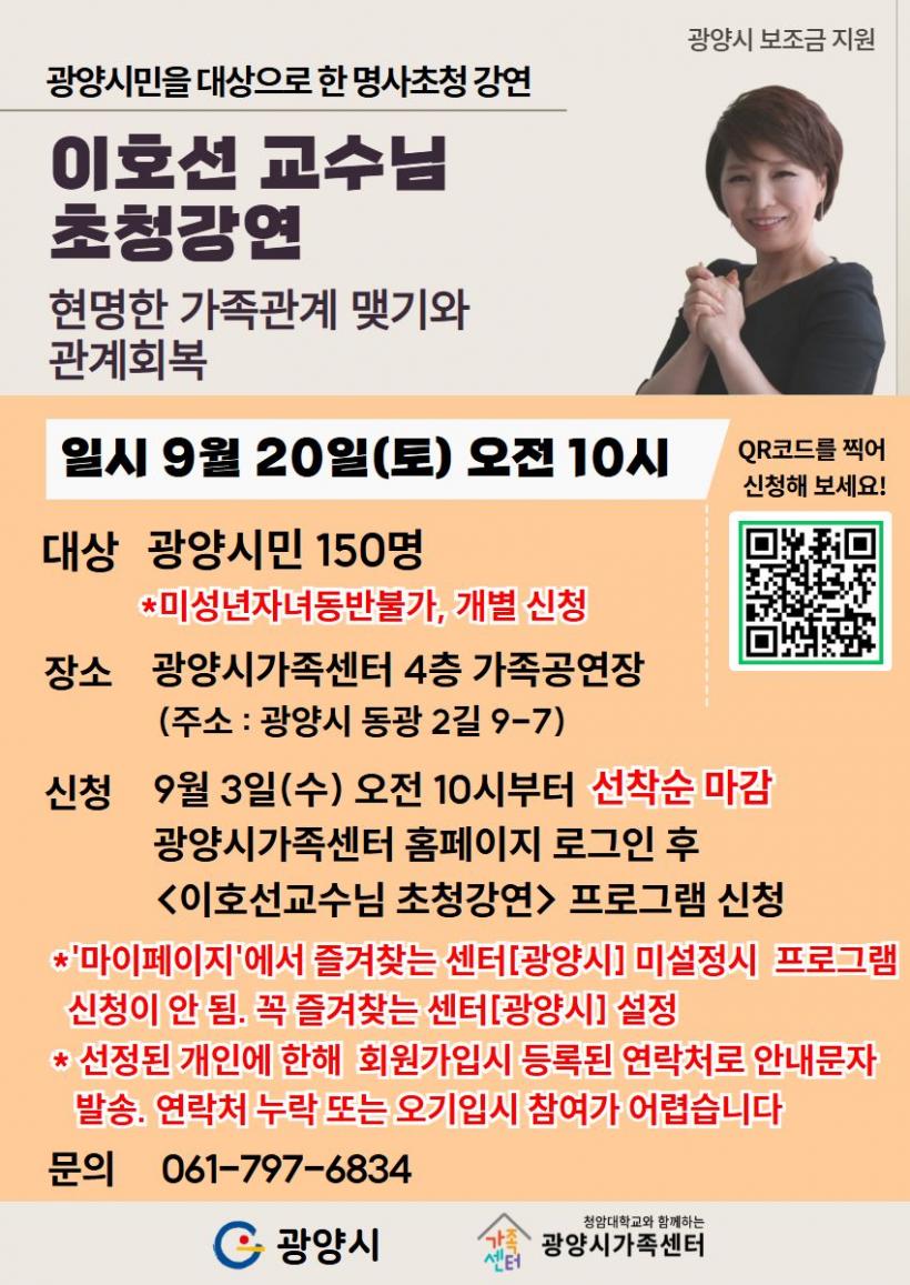 Âü¿© ½ÅûÀº ±¤¾ç½Ã¹Î ´©±¸³ª ¹«·á·Î °¡´ÉÇϸç, 9¿ù 3ÀÏ ¿ÀÀü 10½ÃºÎÅÍ ±¤¾ç½Ã°¡Á·¼¾ÅÍ È¨ÆäÀÌÁö¿¡¼ ¼±Âø¼ø 150¸íÀ» Á¢¼öÇÑ´Ù. ÀÚ¼¼ÇÑ »çÇ×Àº īī¿ÀÅå Ç÷¯½ºÄ£±¸ ¡®±¤¾ç½Ã°¡Á·¼¾ÅÍ¡¯ ä³Î ¶Ç´Â ±¤¾ç½Ã°¡Á·¼¾ÅÍ È¨ÆäÀÌÁö(gwangyang.familynet.or.kr)¿¡¼ È®ÀÎÇÒ ¼ö ÀÖ´Ù.