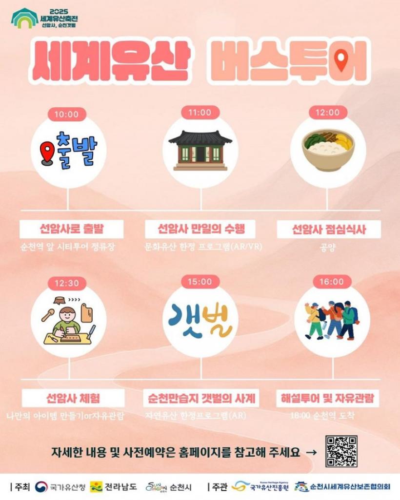 [°ø°£´º½º = ±è¿ëÁø±âÀÚ] ¼øÃµ½Ã(½ÃÀå ³ë°ü±Ô)¿Í ¼øÃµ½Ã ¼¼°èÀ¯»êº¸Á¸ÇùÀÇȸ(À§¿øÀå ±èÁؼ±)´Â ¿À´Â 12ÀϺÎÅÍ 27ÀϱîÁö ¡®2025 ¼¼°èÀ¯»êÃàÀü ¼±¾Ï»ç, ¼øÃµ°¹¹ú¡¯ ¹ö½ºÅõ¾î ÇÁ·Î±×·¥À» ¿î¿µÇÑ´Ù°í ¹àÇû´Ù.