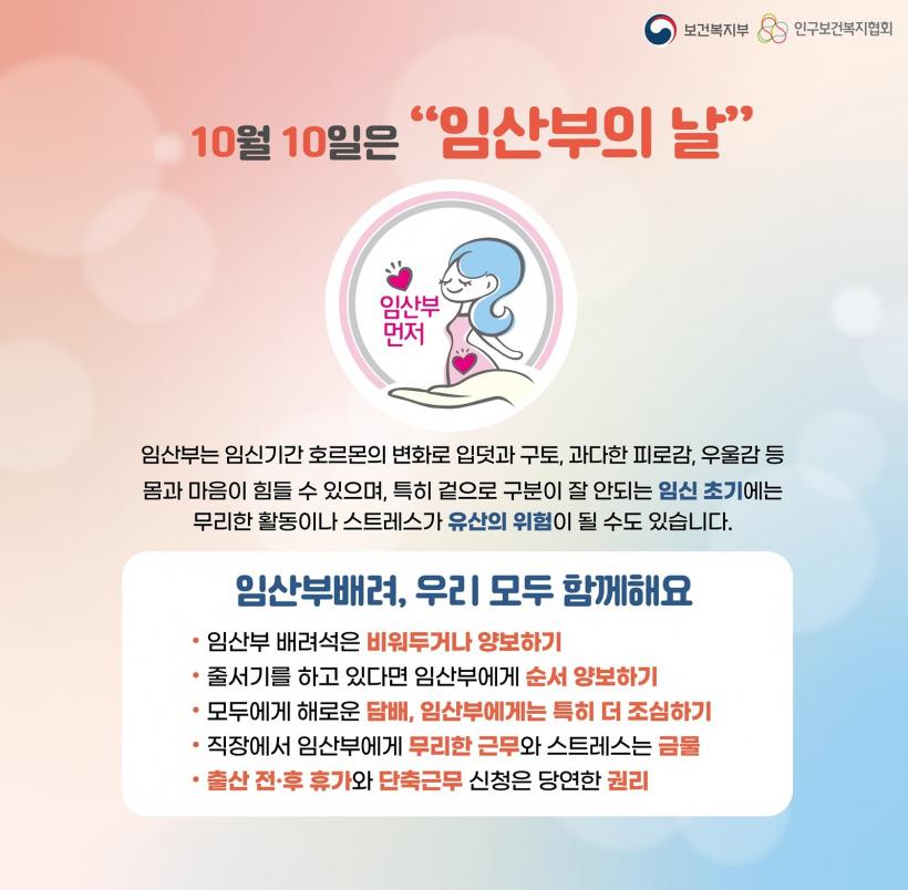 ¿ÃÇØ·Î Á¦20ȸ¸¦ ¸Â´Â ÀÓ»êºÎÀÇ ³¯Àº ¡®¸ðÀÚº¸°Ç¹ý¡¯¿¡ µû¶ó Á¦Á¤µÈ ¹ýÁ¤ ±â³äÀϷΠdz¿ä¿Í ¼öÈ®À» »ó¡ÇÏ´Â 10¿ù°ú ÀӽűⰣ 10°³¿ùÀ» ÀǹÌÇÏ´Â 10¿ù 10ÀÏÀÌ´Ù. ÀÓ»êºÎÀÇ ³¯Àº ÀӽŰú Ãâ»êÀÌ »çȸÀûÀ¸·Î Á¸Áß¹Þ°í ¾çÀ°ÀÇ ¾î·Á¿òÀ» ÇÔ²² ÇØ°áÇØ¾ß ÇÑ´Ù´Â »çȸÀû ¸Þ½ÃÁö¸¦ ´ã°í ÀÖ´Ù.