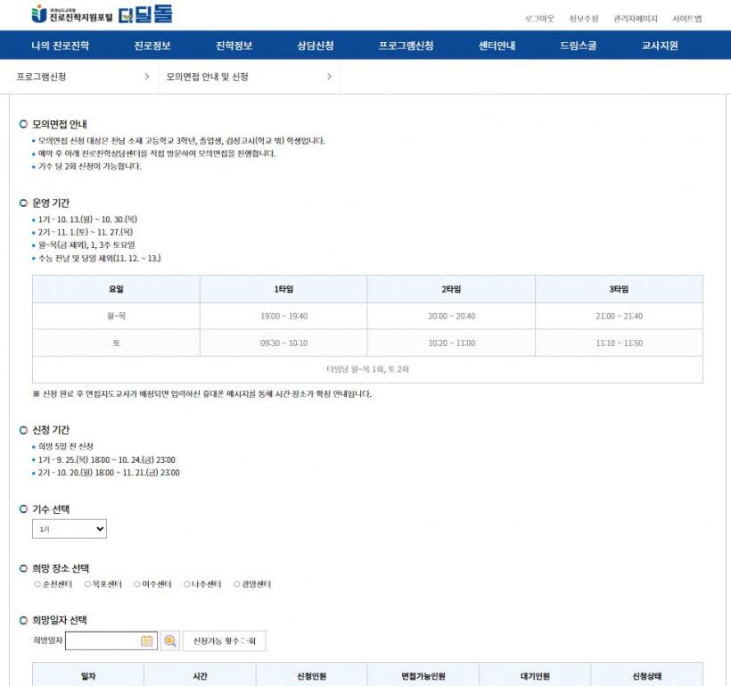 Âü°¡ ½ÅûÀº Àü³²Áø·ÎÁøÇÐÁö¿øÆ÷ÅÐ(https://jdream.jne.go.kr)¿¡¼ °¡´ÉÇÏ´Ù. Áö³ÇرîÁö ¹ø°Å·Î¿ü´ø ÀýÂ÷´Â ½Åû ÇÁ·Î±×·¥ °³¹ß·Î ¿ÃÇØ ´ëÆø °£¼ÒȵƴÙ. ¶Ç ½Åû ¸¶°¨ ÈÄ¿¡µµ ´ë±â µî·ÏÀÌ °¡´ÉÇØ °á¿ø ¹ß»ý ½Ã ´õ ¸¹Àº ÇлýÀÌ ±âȸ¸¦ ¾òÀ» ¼ö ÀÖµµ·Ï Çß´Ù. ÀÌ´Â ±×µ¿¾È ¼öÇè»ýÀÌ ¾Æ½¬¿öÇß´ø ºÎºÐÀ» º¸¿ÏÇÑ Á¶Ä¡ÀÌ´Ù.