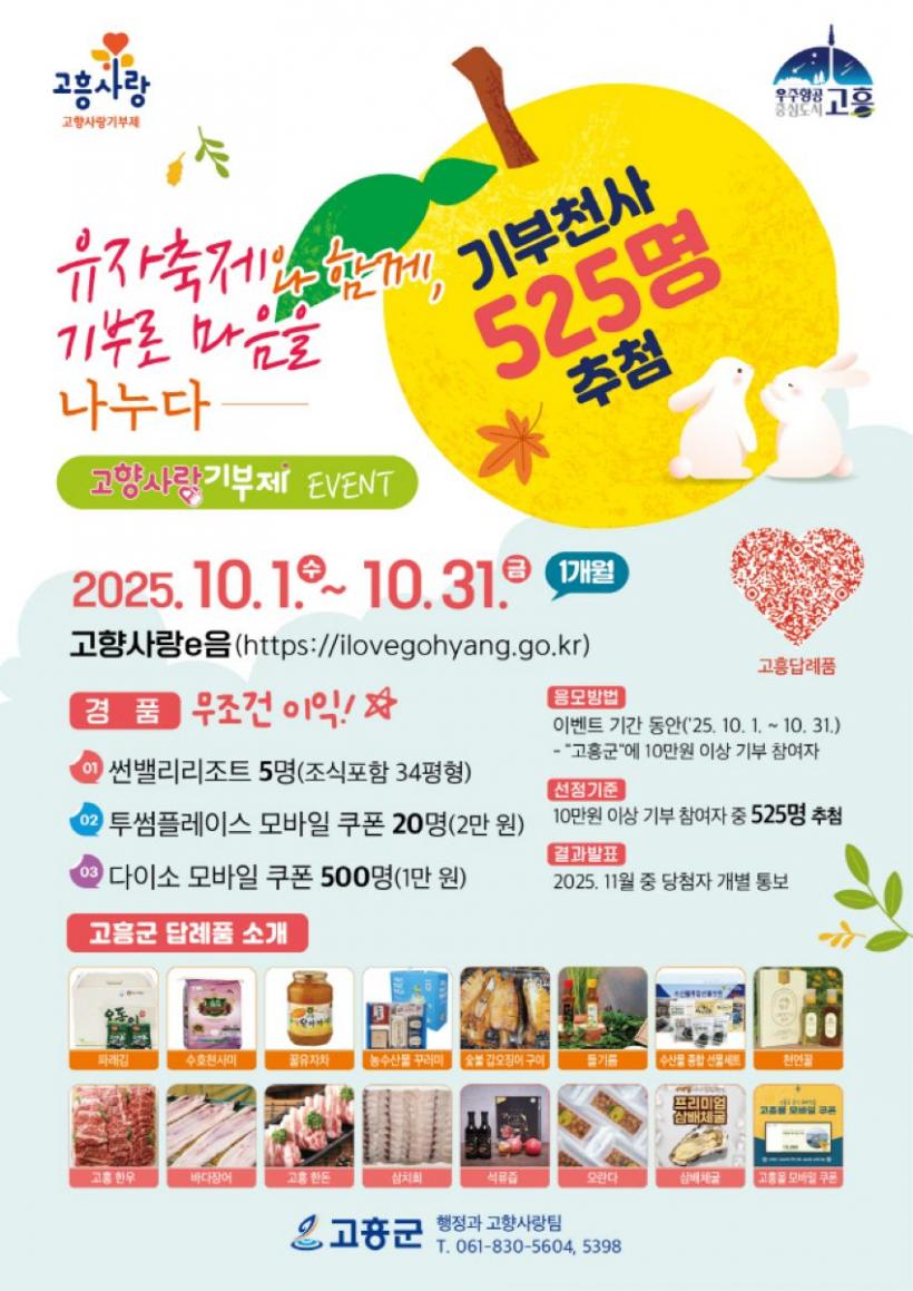 À̺¥Æ® ±â°£(10.1~10.31) Áß °íÈﱺ¿¡ 10¸¸ ¿ø ÀÌ»ó ±âºÎÇÑ Âü¿©ÀÚ´Â ÀÚµ¿ ÀÀ¸ðµÇ¸ç, Ãß÷À» ÅëÇØ ÃÑ 525¸í¿¡°Ô ǪÁüÇÑ ¼±¹°ÀÌ Á¦°øµÈ´Ù. °æÇ°Àº ¡ã°íÈï ½ã¹ë¸® ¼÷¹Ú±Ç(Á¶½Ä Æ÷ÇÔ, 36ÆòÇü) 5¸í ¡ãÅõ½æÇ÷¹À̽º ¸ð¹ÙÀÏ À½·á ÄíÆù(2¸¸ ¿ø±Ç) 20¸í ¡ã´ÙÀÌ¼Ò ¸ð¹ÙÀÏ »óǰ±Ç(1¸¸ ¿ø±Ç) 500¸íÀÌ´Ù.