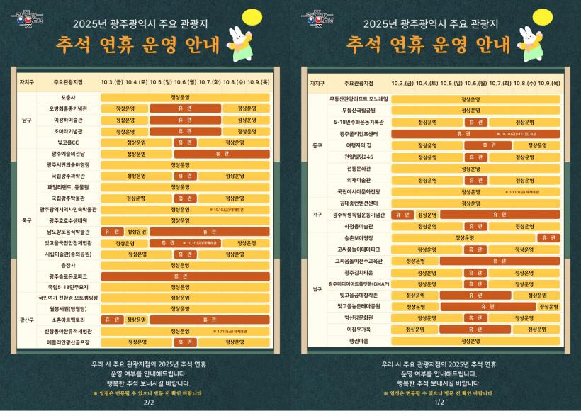 [°ø°£´º½º = ±è¼ö±Ù±âÀÚ] ±¤ÁÖ±¤¿ª½Ã(½ÃÀå °±âÁ¤)´Â ¡®2025 ±¤Áֹ湮ÀÇ ÇØ¡¯¸¦ ¸Â¾Æ ±ä Ãß¼® ¿¬ÈÞ ±â°£ °¡Á·, ÁöÀΰú ÇÔ²² °¡À»ÀÇ Á¤Ã븦 ¸¸³£ÇÒ ¼ö ÀÖ´Â ±¤ÁÖÀÇ ´Ù¾çÇÑ ¸í¼Ò¿Í °ü±¤Áö¸¦ ÃßõÇÑ´Ù.