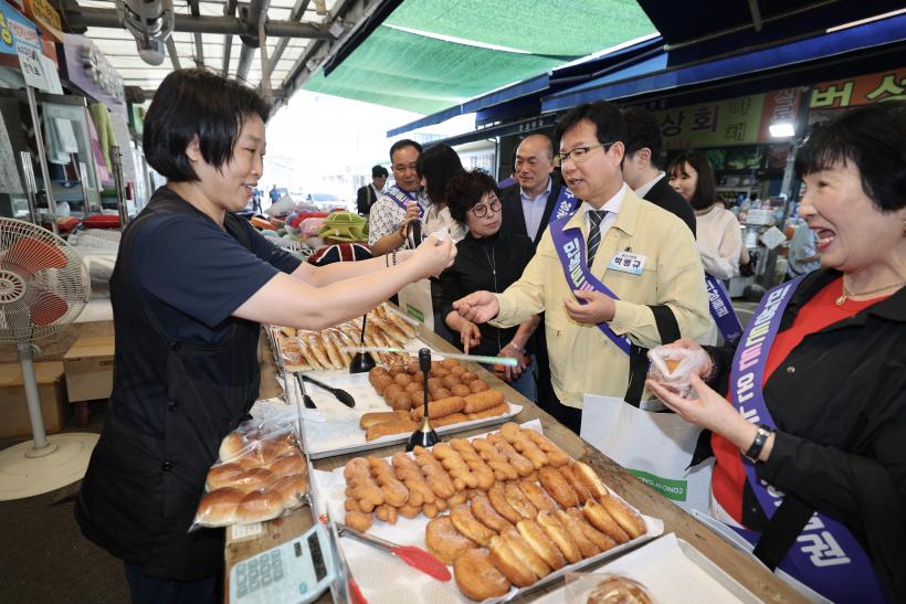 ¹Úº´±Ô ûÀåÀº ¡°¼ÛÁ¤¸ÅÀϽÃÀå »óÀεéÀÇ ¾Ö·Î»çÇ×À» Á÷Á¢ µè°í ¾ç¼Õ °¡µæ ÀåÀ» º¸´Ï ¸¶À½ÀÌ µçµçÇØÁö´Â ±âºÐÀÌ´Ù¡±¸ç ¡°½Ã¹Îµéµµ Áö¿ª»ó±Ç Ȱ¼ºÈ¸¦ À§ÇØ ÀüÅë½ÃÀåÀ» ÀÌ¿ëÇØÁÖ½Ã°í ¿Â´©¸®»óǰ±Ç ȯ±ÞÇà»çµµ ¸¹Àº °ü½É ºÎʵ台´Ù¡±°í ÀüÇß´Ù.