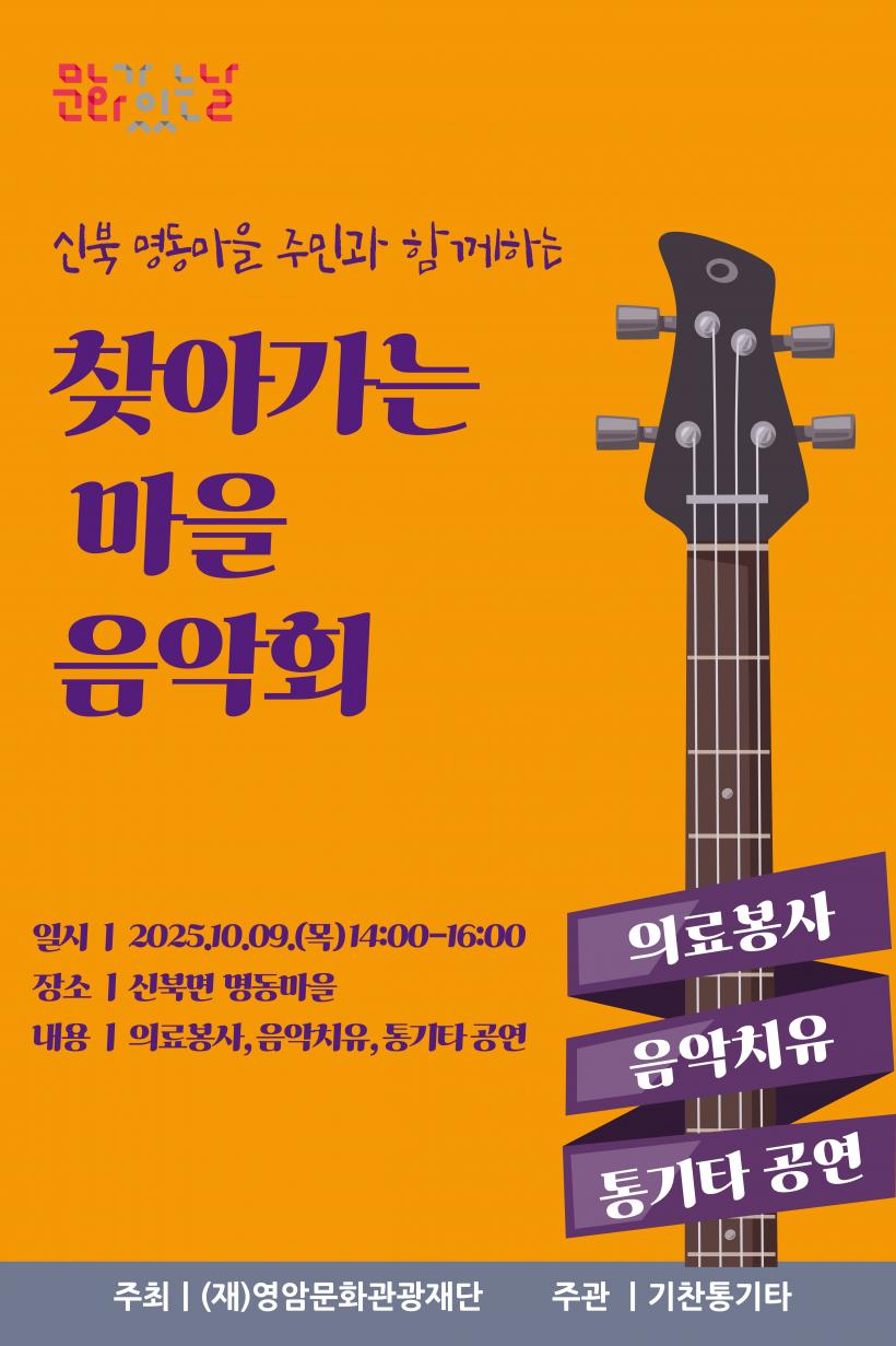 [°ø°£´º½º = ¾ÈÀ翵±âÀÚ] (Àç)¿µ¾Ï¹®È°ü±¤Àç´ÜÀº 2025 ¹®È°¡ ÀÖ´Â ³¯ Çà»çÁö¿ø »ç¾÷À¸·Î »ýȰ¹®È µ¿È£È¸ÀÎ ±âÂùÅë±âŸ(´ëÇ¥:ÃÖ¹®ÀÏ)¿Í ÇÔ²² ½ÅºÏ ¸íµ¿¸¶À» ÁÖ¹ÎÀ» ´ë»óÀ¸·Î ÇÑ ¡®Ã£¾Æ°¡´Â ¸¶À» À½¾Çȸ¡¯¸¦ ¿À´Â 10¿ù 9ÀÏ(¸ñ) Çѱ۳¯¿¡ °³ÃÖÇÑ´Ù°í ¹àÇû´Ù.