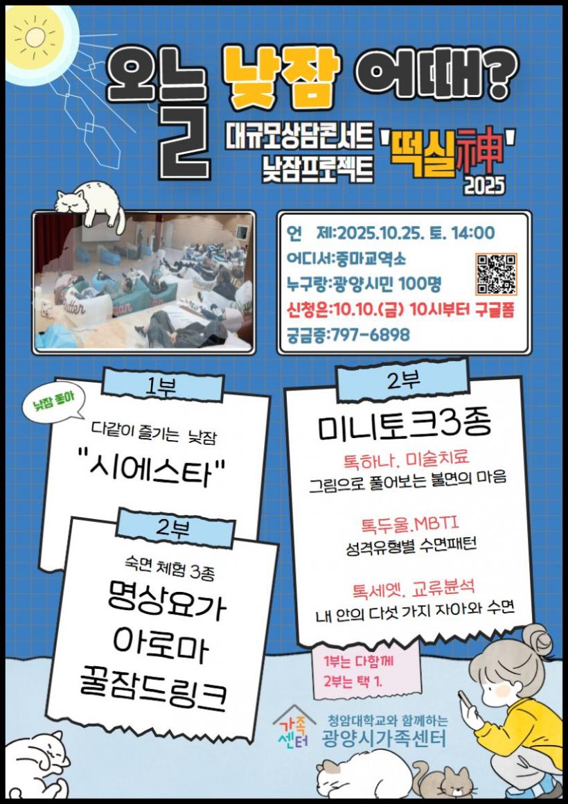 ¼¾ÅÍ´Â À̹ø ÇÁ·Î±×·¥À» ´Ü¼øÇÑ ³·ÀáÀÌ ¾Æ´Ñ, ¼ö¸éÀ» ÁÖÁ¦·Î ÇÑ »ó´ã°ú üÇèÀÌ °áÇÕµÈ ½É¸®¡¤Á¤¼ ȸº¹ ÇÁ·ÎÁ§Æ®·Î ÁøÇàÇÑ´Ù.