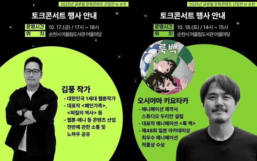 [°ø°£´º½º = ±è¿ëÁø±âÀÚ] ¼øÃµ½Ã(½ÃÀå ³ë°ü±Ô)°¡ ¿À´Â 17Àϰú 18ÀÏ, ¾î¿ï¸²µµ¼°ü ¾î¿ï¸¶´ç¿¡¼ À¥Å÷¡¤¾Ö´Ï¸ÞÀÌ¼Ç ºÐ¾ßÀÇ ±¹³»¿Ü À¯¸íÀλçÀÎ ±èdz ÀÛ°¡¿Í ¿À½Ã¾ß¸¶ Ű¿äŸī °¨µ¶ÀÇ ÅäÅ©ÄܼƮ¸¦ °³ÃÖÇÑ´Ù°í ¹àÇû´Ù.