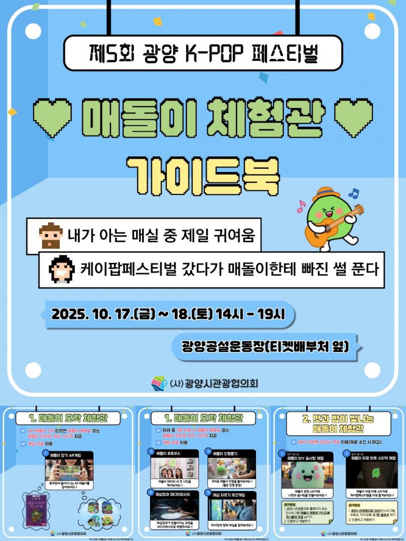 ¡®¸Åµ¹ÀÌ Ã¼Çè°ü¡¯Àº ±¤¾çÀÇ ´ëÇ¥ ij¸¯ÅÍ ¡®¸Åµ¹ÀÌ¡¯¸¦ ÁÖÁ¦·Î ÇÑ ¿À°¨Çü üÇè °ø°£À¸·Î, ¿À´Â 10¿ù 17~18ÀÏ ±¤¾ç°ø¼³¿îµ¿Àå¿¡¼ ¿¸®´Â Æä½ºÆ¼¹úÀÇ ÇöÀå ºÐÀ§±â¸¦ ÇÑÃþ °íÁ¶½Ãų Àü¸ÁÀÌ´Ù.