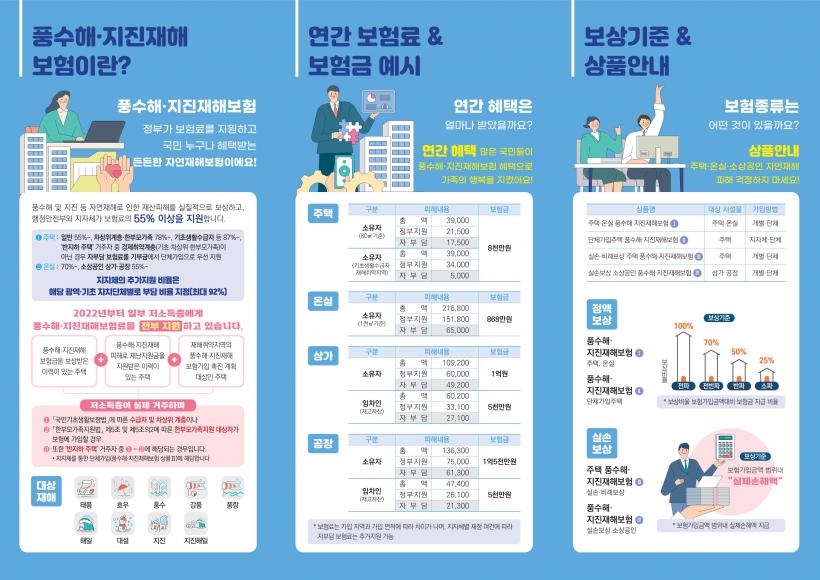 ¡®Ç³¼öÇØ¡¤ÁöÁøÀçÇØº¸Ç衯Àº ÅÂdz, È£¿ì, È«¼ö, °Ç³ µî dz¼öÇØ¿Í ÁöÁøÀ¸·Î ÀÎÇÑ ÇÇÇØ¸¦ Æø³Ð°Ô º¸ÀåÇÏ´Â Á¤Ã¥¼º º¸ÇèÀ¸·Î, °¡ÀÔ ´ë»óÀº ¡ãÁÖÅÃ(µ¿»ê Æ÷ÇÔ) ¡ã¿Â½Ç(ºñ´ÒÇϿ콺 Æ÷ÇÔ) ¡ã»ó°¡¡¤°øÀå(¼Ò»ó°øÀÎ) µîÀ̸ç, º¸Çè±â°£Àº 1³âÀÌ´Ù. º¸Çè·á´Â ½Ã¼³ À¯Çü°ú ´ë»ó¿¡ µû¶ó Â÷µî Áö¿øµÈ´Ù.