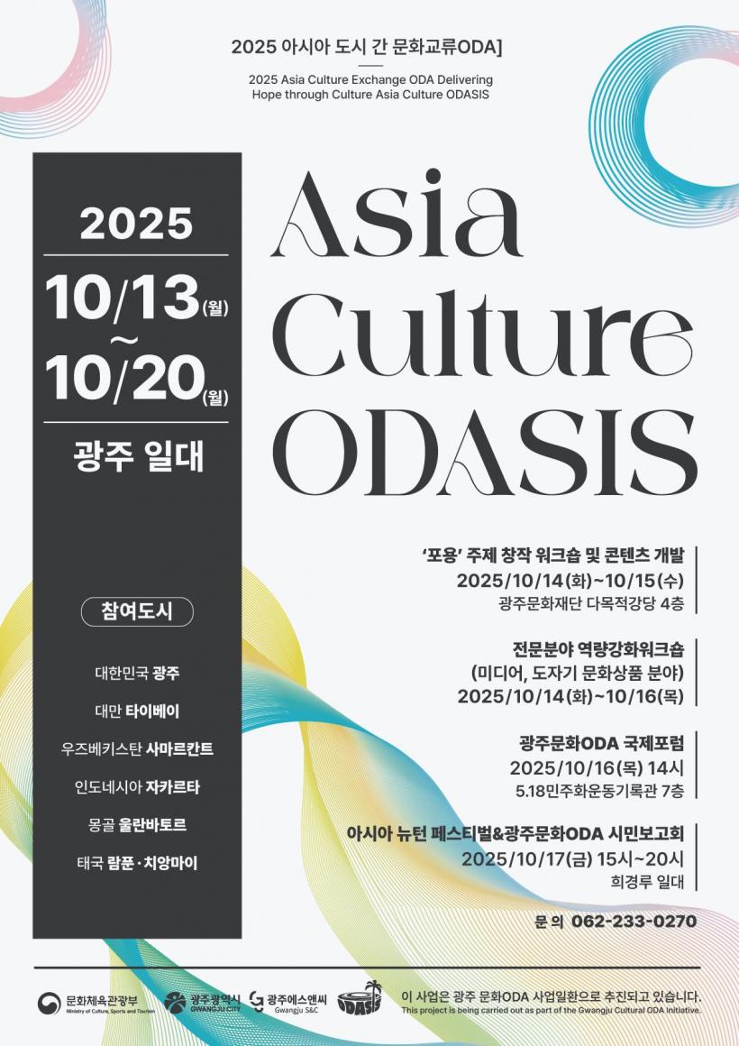 ¡®±¤ÁÖÇü ¹®È °øÀû°³¹ß¿øÁ¶(ODA)-¾Æ½Ã¾Æ ÄÃÃÄ ¿À´Ù½Ã½º(Asia Culture ODASIS)¡¯´Â ±¤ÁÖ¸¦ Áß½ÉÀ¸·Î ¡ã¸ù°ñ ¿ï¶õ¹ÙÅ丣 ¡ãÀεµ³×½Ã¾Æ ÀÚÄ«¸£Å¸ ¡ãű¹ ¶÷Ǭ¡¤Ä¡¾Ó¸¶ÀÌ ¡ã¿ìÁŰ½ºÅº »ç¸¶¸£ÄÆ® ¡ã´ë¸¸ Ã¢È µî ¾Æ½Ã¾Æ 6°³±¹ 7°³ µµ½ÃÀÇ Ã»³â¿¹¼ú°¡ 70¿© ¸íÀÌ Âü¿©ÇÏ´Â ±¹Á¦ ¹®È¿¹¼ú Çù·Â»ç¾÷ÀÌ´Ù. À̵éÀº µµ½ÃÀç»ý, Áö¿ª Æ¯È ¹®È»óǰ °³¹ß, ¹Ìµð¾î¾ÆÆ® µî ´Ù¾çÇÑ Çù¾÷ÇÁ·ÎÁ§Æ®¸¦ ÃßÁøÇß´Ù.