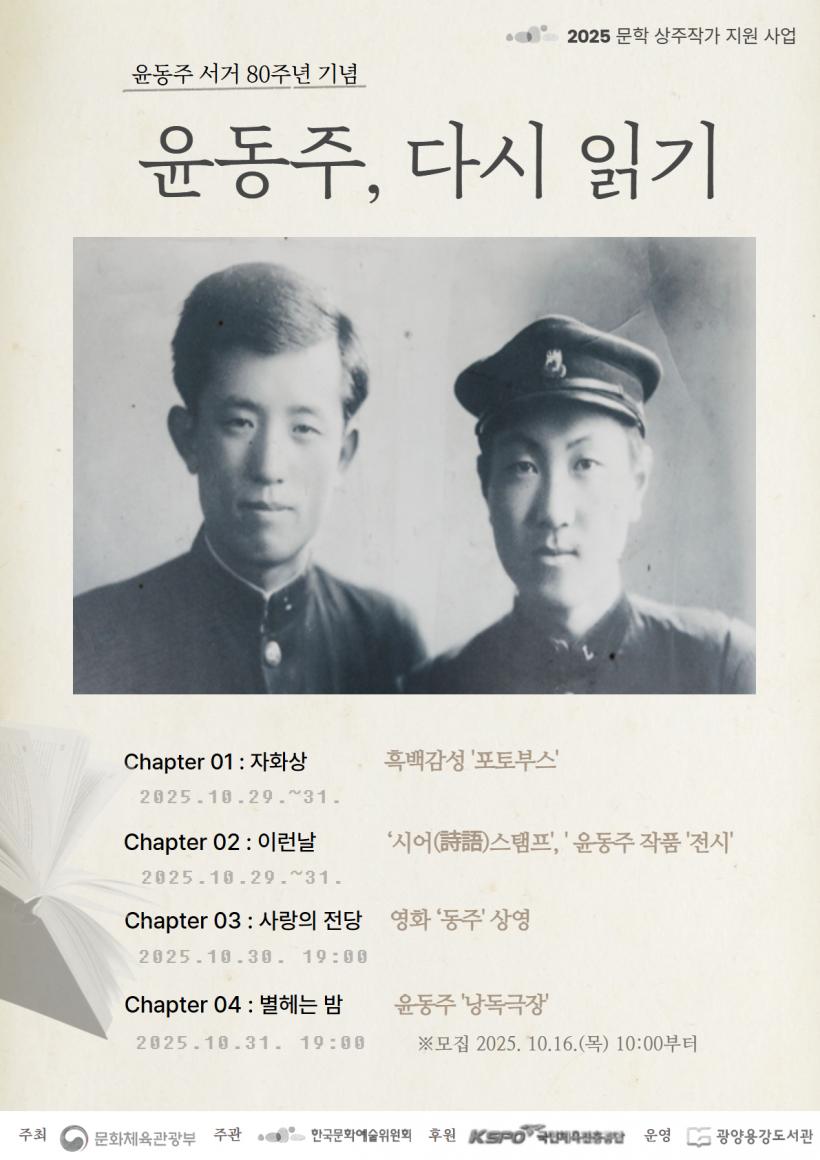 [°ø°£´º½º = Àå¿ÁÁø±âÀÚ] ±¤¾ç¿ë°µµ¼°üÀÌ À±µ¿ÁÖ ¼°Å 80ÁÖ³âÀ» ¸Â¾Æ ¿À´Â 10¿ù 29ÀϺÎÅÍ 31ÀϱîÁö ±×ÀÇ »î°ú ÀÛǰ¼¼°è¸¦ ´Ù¾çÇÑ ¹æ½ÄÀ¸·Î Á¶¸íÇÏ´Â ÇÁ·Î±×·¥ ¡®À±µ¿ÁÖ, ´Ù½Ã Àб⡯¸¦ ¿î¿µÇÑ´Ù.
