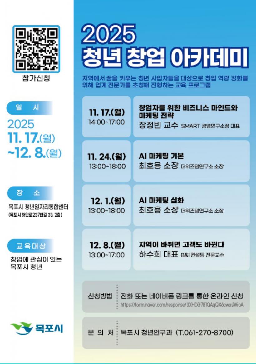 [°ø°£´º½º = ¹Ú¼º¿Á±âÀÚ] ¸ñÆ÷½Ã´Â Áö¿ª û³â â¾÷ÀÚÀÇ °æÀï·Â °È¸¦ À§ÇØ ¿À´Â 11¿ù 17ÀϺÎÅÍ 12¿ù 8ÀϱîÁö ÃÑ 4ȸ¿¡ °ÉÃÄ ¡®2025³â û³â â¾÷ ¾ÆÄ«µ¥¹Ì¡¯¸¦ ¿î¿µÇÑ´Ù.