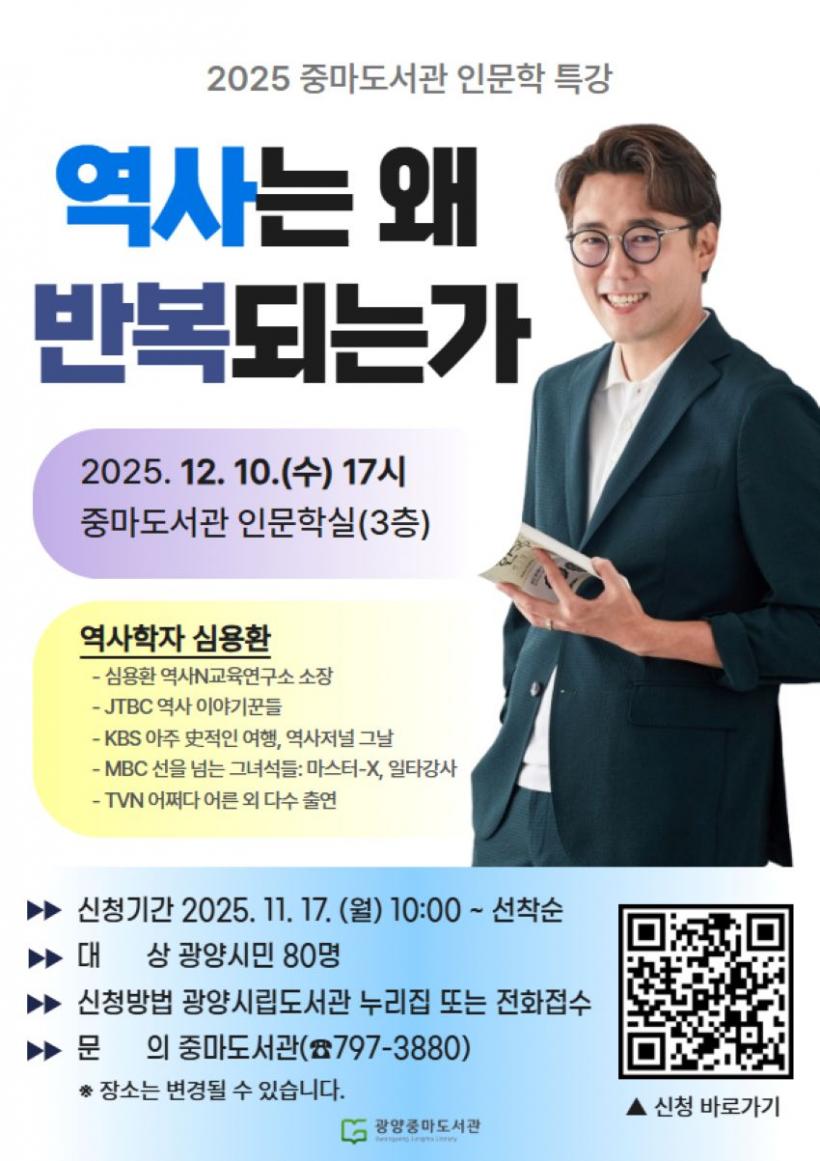 [°ø°£´º½º = Àå¿ÁÁø±âÀÚ] ±¤¾çÁ߸¶µµ¼°üÀº ¿À´Â 12¿ù 10ÀÏ(¼ö) ¿ÀÈÄ 5½Ã, Àι®Çнǿ¡¼ ¿ª»çÇÐÀÚ ½É¿ëȯÀ» ÃÊÃ»ÇØ ¡®¿ª»ç´Â ¿Ö ¹Ýº¹µÇ´Â°¡¡¯¸¦ ÁÖÁ¦·Î Àι®ÇРƯ°À» °³ÃÖÇÑ´Ù°í ¹àÇû´Ù.