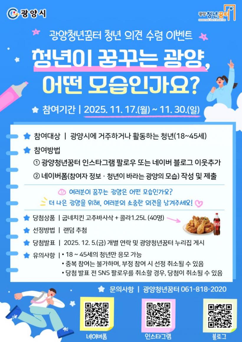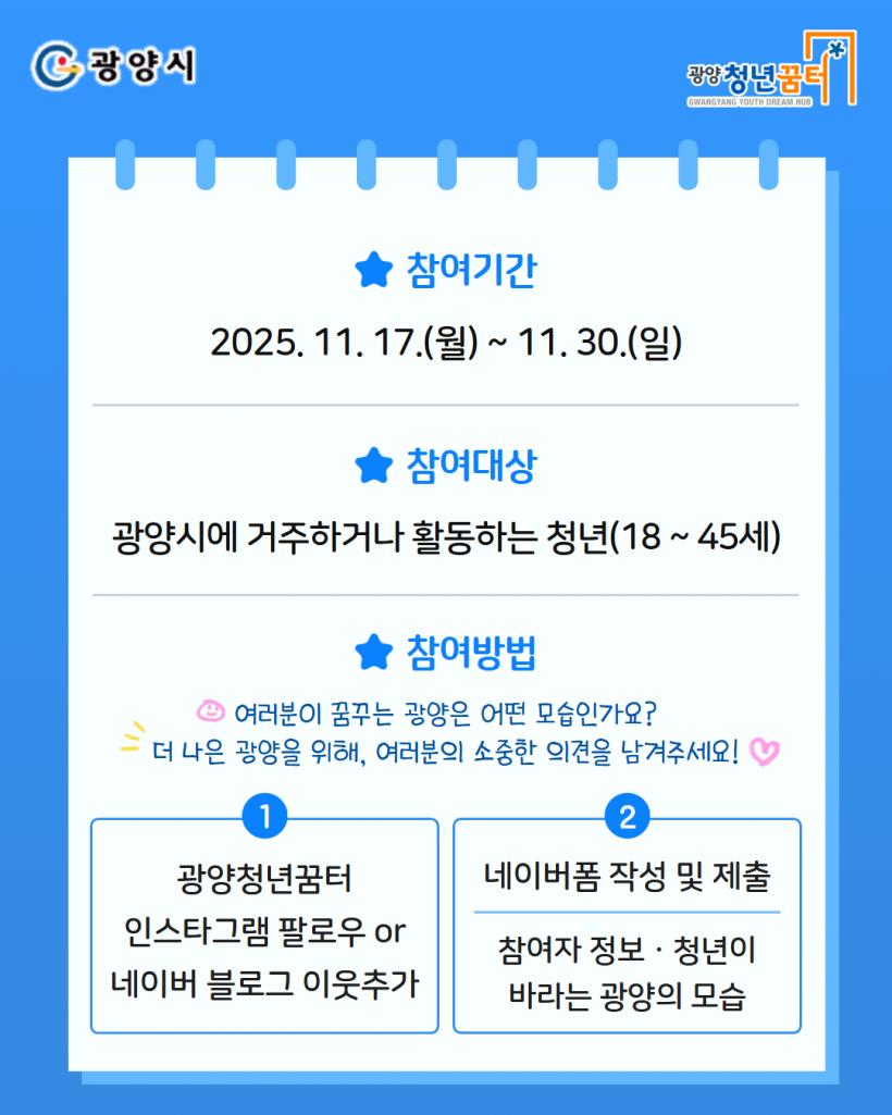 Âü¿© ´ë»óÀº ±¤¾ç½Ã¿¡ °ÅÁÖÇϰųª ±¤¾ç½Ã¿¡¼ Ȱµ¿Çϰí ÀÖ´Â 18¼¼~45¼¼ ÀÌÇÏ Ã»³âÀÌ´Ù. Âü¿© ¹æ¹ýÀº ±¤¾çû³â²ÞÅÍ °ø½Ä SNS(³×À̹ö ºí·Î±×¡¤ÀνºÅ¸±×·¥) Áß ÇÑ °÷À» ÆÈ·Î¿ìÇÑ µÚ, ¡®Ã»³âÀÌ ¹Ù¶ó´Â ±¤¾çÀÇ ¸ð½À¡¯À» ÀÚÀ¯·Ó°Ô ÀÛ¼ºÇØ ÆÈ·Î¿ì ÀÎÁõ°ú ÇÔ²² ³×À̹öÆûÀ¸·Î Á¦ÃâÇÏ¸é µÈ´Ù.