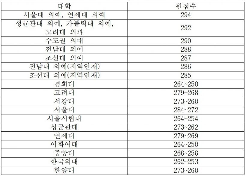 ¼¿ï ÁÖ¿ä ´ëÇÐ Áö¿ø °¡´É Á¡¼ö(¸ÞµðÄÃÇаú Á¦¿Ü)´Â ¿øÁ¡¼ö ±âÁØ ¡ã °æÈñ´ë(264~250) ¡ã °í·Á´ë(279~268) ¡ã ¼°´ë(273~260) ¡ã ¼¿ï½Ã¸³´ë(264~254) ¡ã ¼º±Õ°ü´ë(273~262) ¡ã ¿¬¼¼´ë(279~269) ¡ã ÀÌÈ¿©´ë(264~250) ¡ã Áß¾Ó´ë(268~258) ¡ã Çѱ¹¿Ü´ë(262~253) ¡ã ÇѾç´ë(273~260)·Î ¿¹ÃøÇß´Ù.
