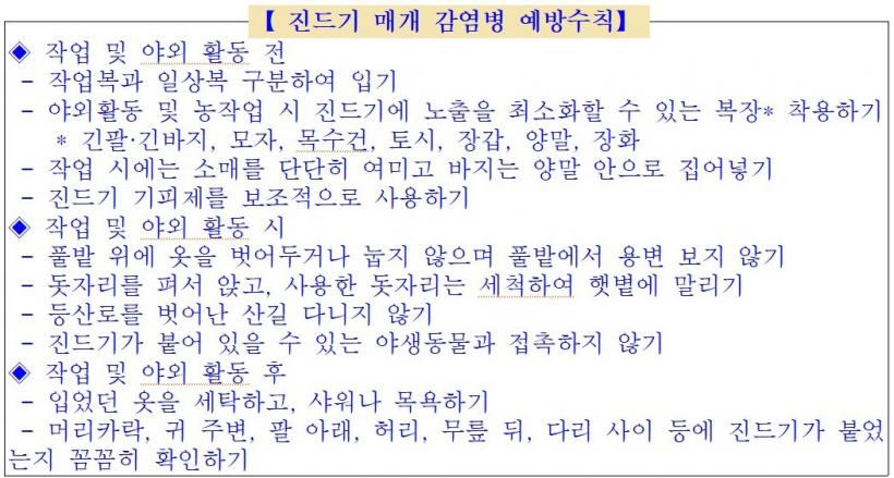 Á¤±¤¼± Àü³²µµ º¸°Çº¹Áö±¹ÀåÀº ¡°¾ß¿ÜȰµ¿À̳ª ³óÀÛ¾÷À» ÇÒ ¶§ ¿¹¹æ¼öÄ¢À» ¹Ýµå½Ã ÁؼöÇϰí, ÀÌÈÄ ¹°¸° ÀÚ±¹(°¡ÇÇ)ÀÌ °üÂûµÇ°Å³ª, ¹ß¿¡¤¹ßÁø µî Áõ»óÀÌ ³ªÅ¸³ª¸é Áöü¾øÀÌ ÀÇ·á±â°üÀ» ¹æ¹®ÇØ Áø·á¹Þ±æ ¹Ù¶õ´Ù¡±°í ´çºÎÇß´Ù.