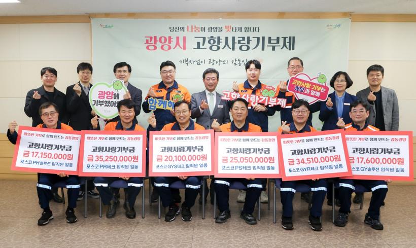 Æ÷½ºÄÚ ±¤¾ç Á¤ºñ»ç¾÷ȸ»ç ÀÓÁ÷¿ø 733¸íÀº ÃÑ 72,210,000¿øÀ», Æ÷½ºÄÚ Æ÷Ç× Á¤ºñ»ç¾÷ȸ»ç ÀÓÁ÷¿ø 786¸íÀº ÃÑ 77,450,000¿øÀ» ±âºÎÇÏ¸ç °íÇâ»ç¶û±âºÎÁ¦¸¦ ÅëÇÑ »ó»ý Çù·Â¿¡ µ¿ÂüÇß´Ù.