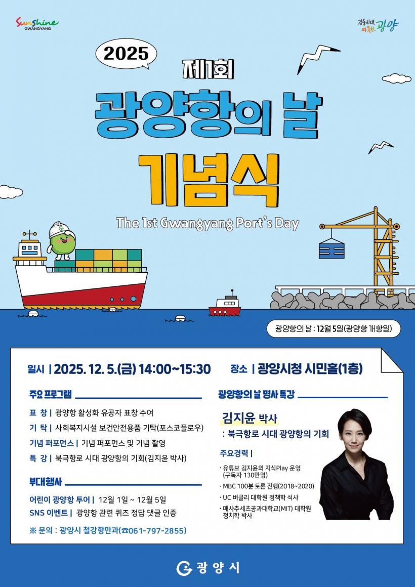 ¶ÇÇÑ ÇùÀÇȸ ÀǰßÀ» ¹Ý¿µÇØ 12¿ù 5ÀÏÀ» ¡®±¤¾çÇ×ÀÇ ³¯¡¯(±¤¾çÇ× °³Ç×ÀÏ)·Î ÁöÁ¤Çß´Ù. ÀÌ´Â Ç׸¸»ê¾÷¿¡ ´ëÇÑ ½Ã¹ÎµéÀÇ ÀÌÇØ¿Í °ü½ÉÀ» ³ôÀ̱â À§ÇÑ °ÍÀ¸·Î, ½Ã´Â ¿ÃÇØ óÀ½À¸·Î Á¦1ȸ ±¤¾çÇ×ÀÇ ³¯ ±â³äÇà»ç¸¦ °³ÃÖÇÒ ¿¹Á¤ÀÌ´Ù.