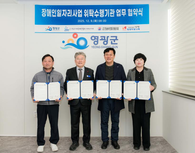 [°ø°£´º½º = ±è¼ö±Ù±âÀÚ] ¿µ±¤±ºÀº Áö³ 12¿ù 9ÀÏ¿¡ 2026³â Àå¾ÖÀÎÀÏÀÚ¸®»ç¾÷ ¼öÇà±â°ü Çù¾à½ÄÀ» °³ÃÖÇϰí, ¡ãÀü³²ÁöüÀå¾ÖÀÎÇùȸ ¿µ±¤±ºÁöȸ ¡ãÀü³²³ó¾ÆÀÎÇùȸ ¿µ±¤±ºÁöȸ ¡ã¿µ±¤µÎºû³ª·¡ ÃÑ 3°³ ±â°ü°ú ³»³âµµ »ç¾÷ ÃßÁøÀ» À§ÇÑ ¾÷¹« Çù¾àÀ» ü°áÇß´Ù.
