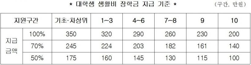 Áö¿ø ±Ý¾×Àº ¼Òµæ±âÁØ(±âÃÊ¡¤Â÷»óÀ§, 1~3±¸°£, 4~6±¸°£, 7~8±¸°£, 9±¸°£, 10±¸°£) ¹× Çлý °ÅÁֱⰣ(7³â ÀÌ»ó 100%, 3³â ÀÌ»ó 5³â ¹Ì¸¸ 70%, 3³â ¹Ì¸¸ 50%)À» °í·ÁÇØ ¿¬ 200¸¸ ¿øÀ» ±âÁØÀ¸·Î ¼Òµæ±¸°£º° 30¸¸ ¿ø¾¿ Áõ¾× Áö±ÞÇϸç ÃÖ´ë ¿¬ 350¸¸ ¿ø±îÁö Áö¿øÇÑ´Ù.
