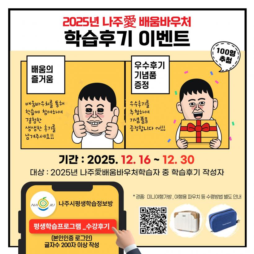 [°ø°£´º½º = ¹Ú¼º¿Á±âÀÚ] Àü¶ó³²µµ ³ªÁֽ𡠽ùΠ´©±¸³ª ¹è¿ò¿¡ Âü¿©ÇÒ ¼ö ÀÖ´Â Æò»ýÇнÀ ȯ°æ Á¶¼ºÀ» À§ÇØ ÃßÁøÇÑ ¡®2025³â ³ªÁÖ¾Ö(äñ)¹è¿ò¹Ù¿ìó¡¯ »ç¾÷À» ¼º°øÀûÀ¸·Î ¸¶¹«¸®Çϰí Âü¿©ÀÚ¸¦ ´ë»óÀ¸·Î ÇÑ ¼³¹®Á¶»ç¿Í ÇнÀÈıâ À̺¥Æ®¸¦ ¿À´Â 30ÀϱîÁö ÁøÇàÇÑ´Ù.