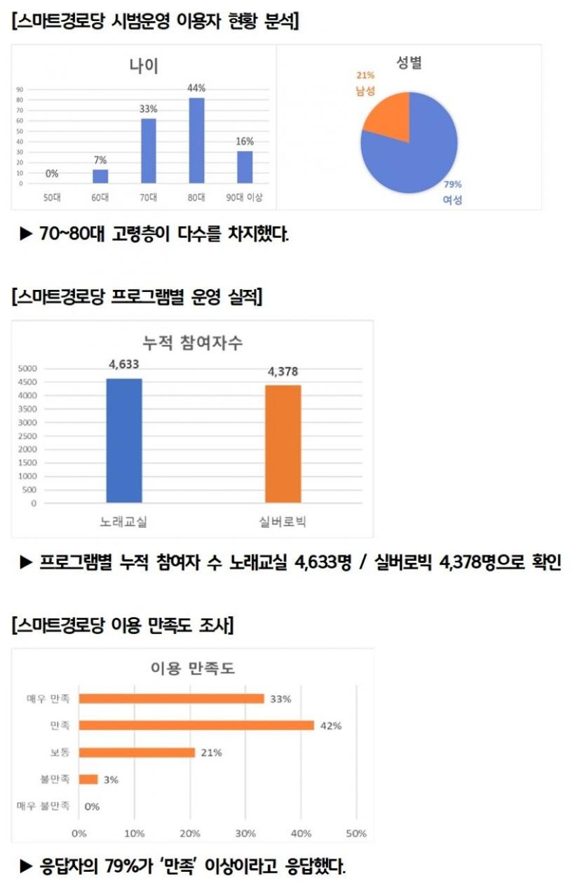 ÀÌ¿ëÀÚ ¼³¹®Á¶»ç °á°ú¿¡¼µµ ±àÁ¤ÀûÀÎ ¹ÝÀÀÀÌ À̾îÁ³´Ù. ÀÀ´äÀÚÀÇ 96%°¡ »ç¾÷ ¿î¿µ¿¡ ´ëÇØ ±àÁ¤Àû(¸¸Á· ÀÌ»ó 75%, º¸Åë 21%)À̶ó°í ´äÇßÀ¸¸ç, 79%´Â ÀÌÈÄ¿¡µµ °è¼Ó ÀÌ¿ëÇϰڴٴ Àǻ縦 ¹àÇû´Ù. À̸¦ ÅëÇØ »ç¾÷ÀÇ Áö¼Ó Çʿ伺ÀÌ È®Àεưí, Âü¿©ÀÚ ´ëºÎºÐÀÌ 70~80´ë °í·ÉÃþÀ¸·Î ½º¸¶Æ®°æ·Î´çÀÌ µðÁöÅÐ Ãë¾à°èÃþÀ» ´ë»óÀ¸·Î È¿°úÀûÀ¸·Î ¿î¿µµÈ °ÍÀ¸·Î ºÐ¼®µÆ´Ù.