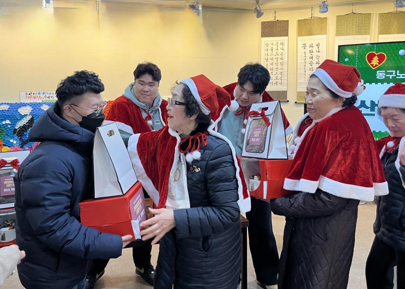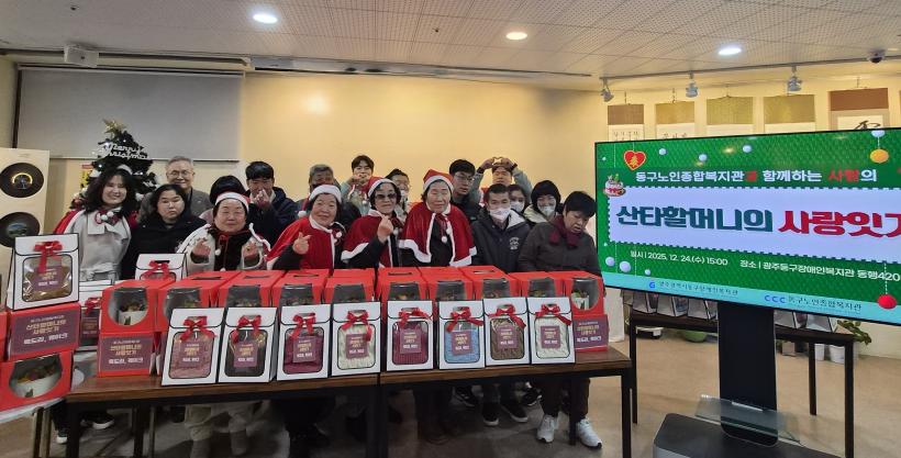 [°ø°£´º½º = ±è´ë¿µ±âÀÚ] ±¤ÁÖ±¤¿ª½Ã µ¿±¸ ³ëÀεéÀÌ Å©¸®½º¸¶½º À̺긦 ¸Â¾Æ Áö¿ª Àå¾ÖÀÎ ÀÌ¿ô¿¡°Ô µû¶æÇÑ Á¤À» ÀüÇÏ´Â ¡®»êŸÇÒ¸Ó´Ï¡¯·Î º¯½ÅÇØ ´«±æÀ» ²ö´Ù.