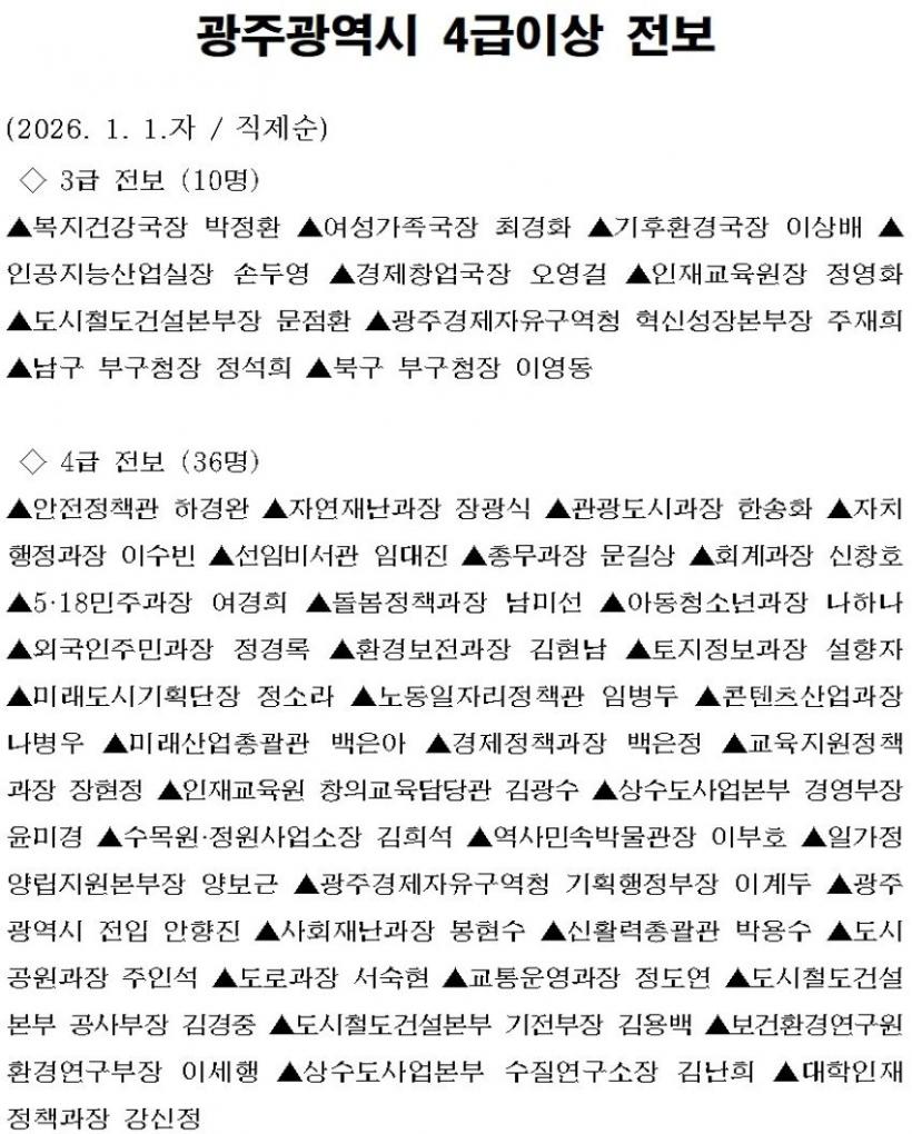 [°ø°£´º½º = ±è¼ö±Ù±âÀÚ] ±¤ÁÖ±¤¿ª½Ã(½ÃÀå °±âÁ¤)´Â 2026³â 1¿ù1ÀÏÀÚ ±¹¡¤°úÀå±Þ 44¸í¿¡ ´ëÇÑ Àüº¸Àλ縦 30ÀÏ ´ÜÇàÇß´Ù.