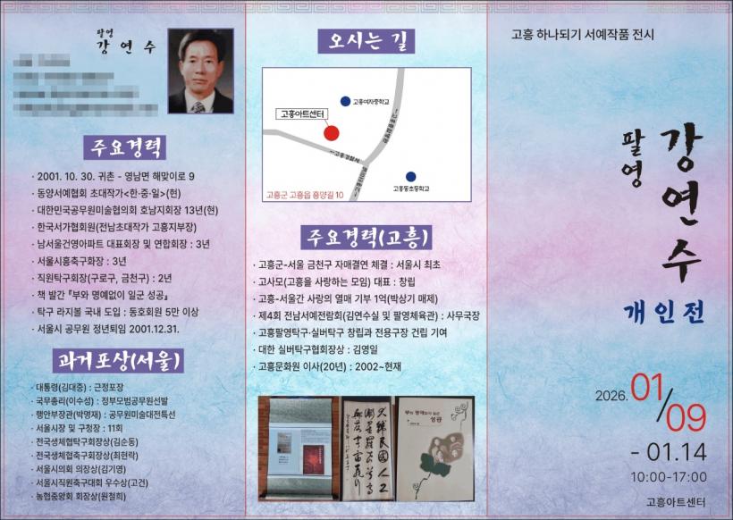 [°ø°£´º½º = ±è¿ëÁø±âÀÚ] °íÈﱺ(±º¼ö °ø¿µ¹Î)Àº ¿À´Â 1¿ù 9ÀϺÎÅÍ 14ÀϱîÁö °íÈï¾ÆÆ®¼¾ÅÍ¿¡¼ ¡®°íÈï ÇϳªµÇ±â ¼¿¹ ÀÛǰ Àü½Ãȸ¡¯¸¦ °³ÃÖÇÑ´Ù°í ¹àÇû´Ù.