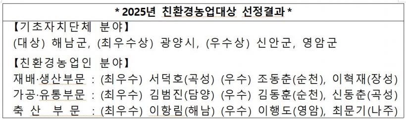 [°ø°£´º½º = ±è¼ö±Ù±âÀÚ] Àü¶ó³²µµ´Â 2025³â Àü³²µµ ģȯ°æ³ó¾÷´ë»ó¿¡ ±âÃÊÀÚÄ¡´Üü ºÐ¾ß¿¡¼ 4°³ ½Ã±º°ú ģȯ°æ³ó¾÷ÀÎ 9¸íÀ» ¼ö»óÀÚ·Î ¼±Á¤Çß´Ù°í ¹àÇû´Ù.