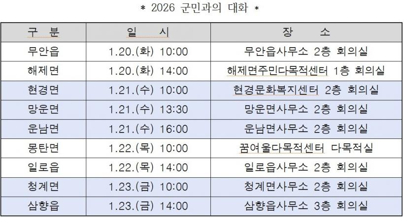 ±º¹Î°úÀÇ ´ëÈ ÀÏÁ¤Àº 1¿ù 20ÀÏ ¹«¾ÈÀ¾¡¤ÇØÁ¦¸éÀ» ½ÃÀÛÀ¸·Î, 21ÀÏ Çö°æ¸é¡¤¸Á¿î¸é¡¤¿î³²¸é, 22ÀÏ ¸ùź¸é¡¤ÀÏ·ÎÀ¾, 23ÀÏ Ã»°è¸é¡¤»ïÇâÀ¾ ¼øÀ¸·Î ÁøÇàµÈ´Ù.