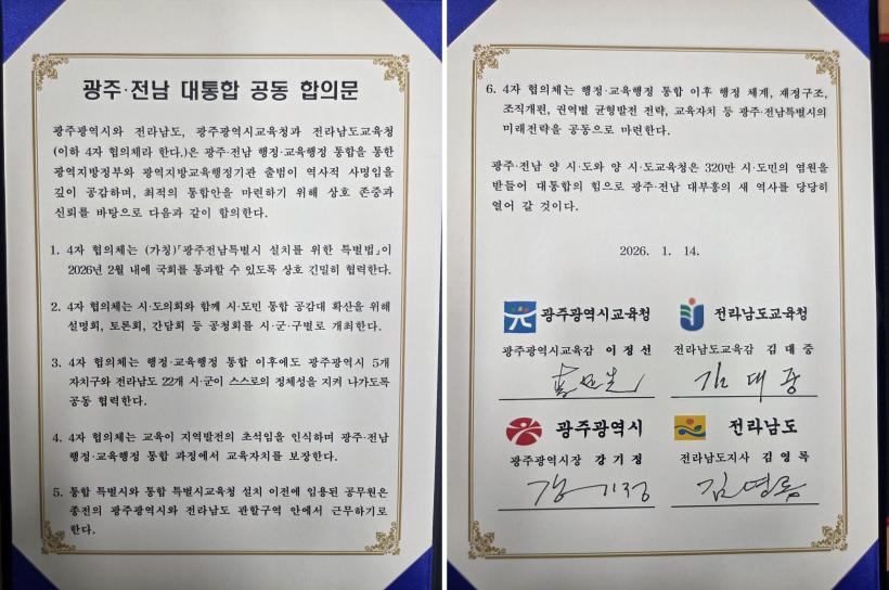 [°ø°£´º½º = ±è¼ö±Ù±âÀÚ] Àü¶ó³²µµ±³À°Ã»°ú ±¤ÁÖ±¤¿ª½Ã±³À°Ã», Àü¶ó³²µµ, ±¤ÁÖ±¤¿ª½Ã(ÀÌÇÏ ¡®4ÀÚ ÇùÀÇü¡¯)°¡ 14ÀÏ ±¤ÁÖ¡¤Àü³² ÇàÁ¤¡¤±³À° ÅëÇÕ¿¡ ÇÕÀÇÇß´Ù.