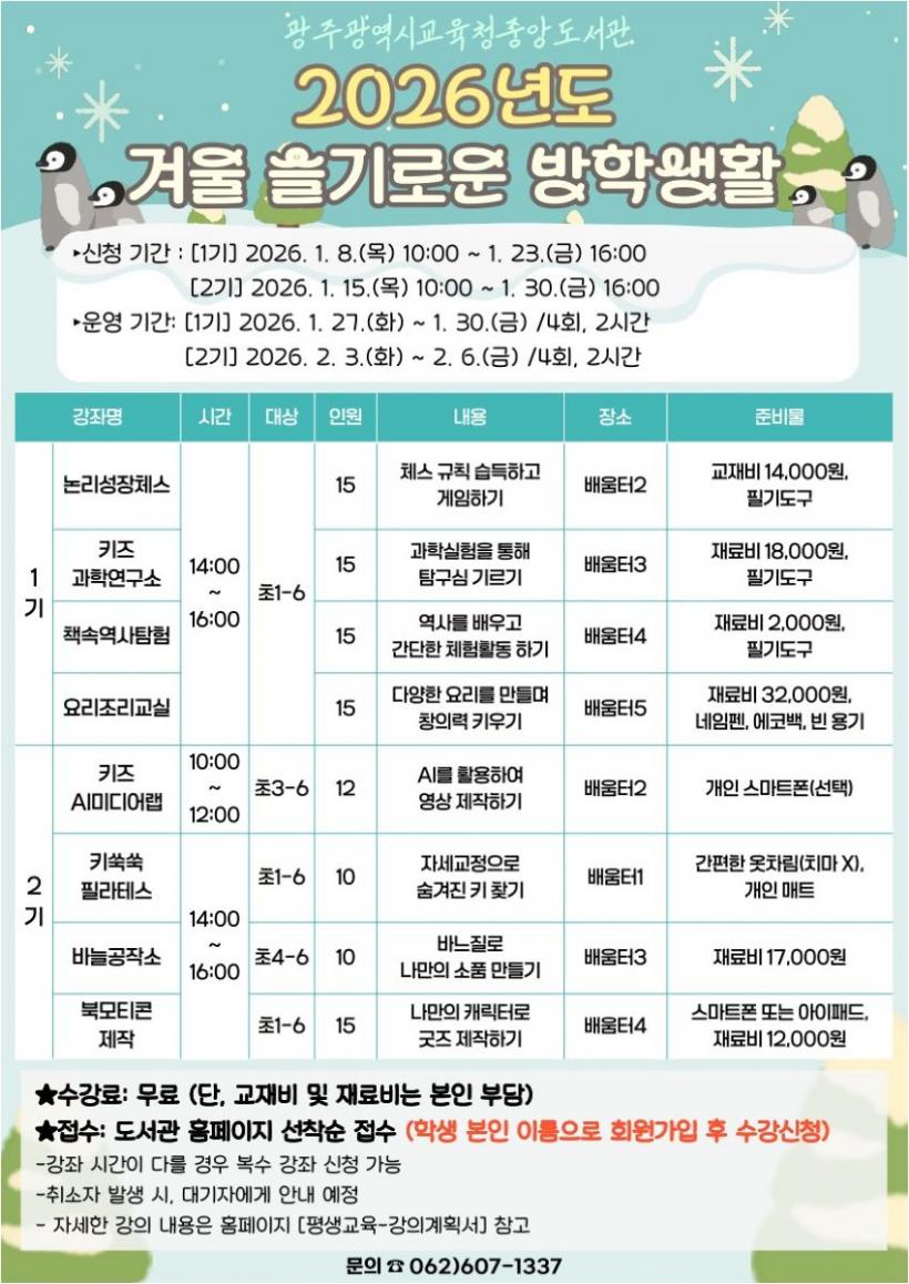 [°ø°£´º½º = ±è¼ö±Ù±âÀÚ] ±¤Áֽñ³À°Ã»Áß¾Óµµ¼°ü(ÀÌÇÏ ±¤ÁÖÁß¾Óµµ¼°ü)Àº °Ü¿ï¹æÇÐÀ» ¸Â¾Æ ¿À´Â 27ÀϺÎÅÍ 2¿ù 6ÀϱîÁö ÃʵîÇлýÀ» ´ë»óÀ¸·Î ¡®°Ü¿ï ½½±â·Î¿î ¹æÇлýȰ¡¯À» ¿î¿µÇÑ´Ù.
