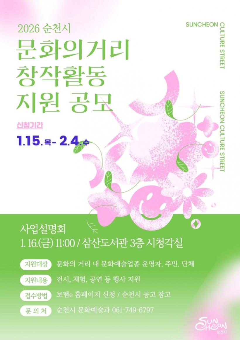 [°ø°£´º½º = ±è¿ëÁø±âÀÚ] ¼øÃµ½Ã´Â ¹®ÈÀÇ °Å¸®¸¦ ¿¹¼úÆ¯È °ÅÁ¡Áö¿ªÀ¸·Î À°¼ºÇϰí Áö¿ª ¿¹¼úÀÎÀÇ Áö¼Ó°¡´ÉÇÑ Ã¢ÀÛȰµ¿À» Áö¿øÇϱâ À§ÇØ ¡®2026³â ¼øÃµ½Ã ¹®ÈÀÇ °Å¸® âÀÛȰµ¿ Áö¿ø»ç¾÷¡¯ Âü¿©ÀÚ¸¦ °ø°³ ¸ðÁýÇÑ´Ù°í ¹àÇû´Ù.