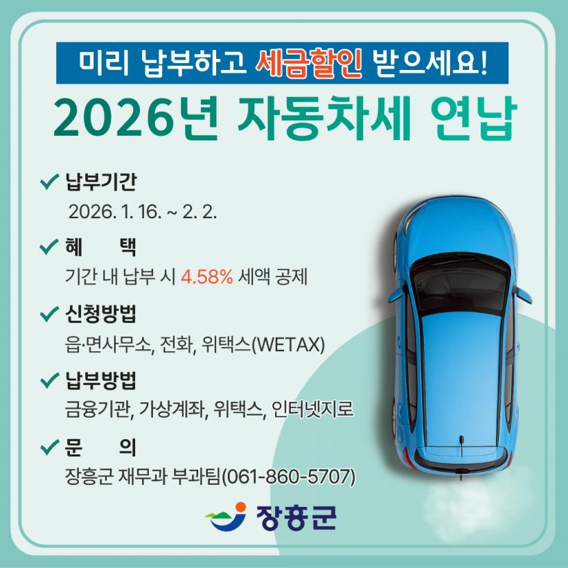 [°ø°£´º½º = ±è¼ö±Ù±âÀÚ] ÀåÈﱺÀº Áö³ 15ÀÏ 2026³âµµ ÀÚµ¿Â÷¼¼ ¿¬³³ °íÁö¼¸¦ ÀåÈﱺ¿¡ µî·ÏµÈ ¸ðµç Â÷·® ¼ÒÀ¯ÀÚ¿¡°Ô Àϰý ¹ß¼ÛÇß´Ù°í ¹àÇû´Ù.