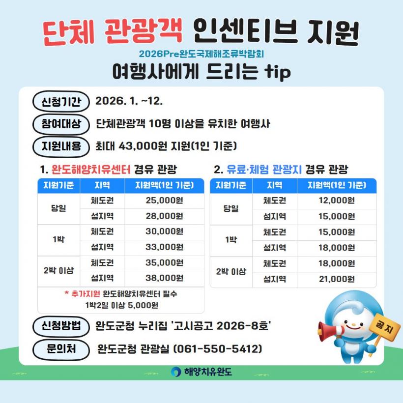 Áö¿ø ±âÁØÀº ³»・¿Ü±¹ÀÎ ´Üü °ü±¤°´ 10¸í ÀÌ»ó À¯Ä¡ ½Ã ´çÀÏ ±âÁØ Ã¼µµ(À°Áö)±ÇÀº 1ÀÎ ´ç 12,000¿ø, ¼¶ Áö¿ªÀº 15,000¿øÀÌ Áö¿øµÈ´Ù.