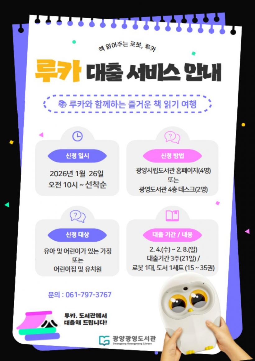 [°ø°£´º½º = Àå¿ÁÁø±âÀÚ] ±¤¿µµµ¼°üÀº 2025³â¿¡ À̾î 2026³â¿¡µµ Ã¥ ÀоîÁÖ´Â ÀΰøÁö´É(AI) µ¶¼ ·Îº¿ ¡®·çÄ«(LUKA)¡¯¸¦ Ȱ¿ëÇÑ µµ¼ ´ëÃâ ¼ºñ½º¸¦ ¿î¿µÇÑ´Ù°í ¹àÇû´Ù.