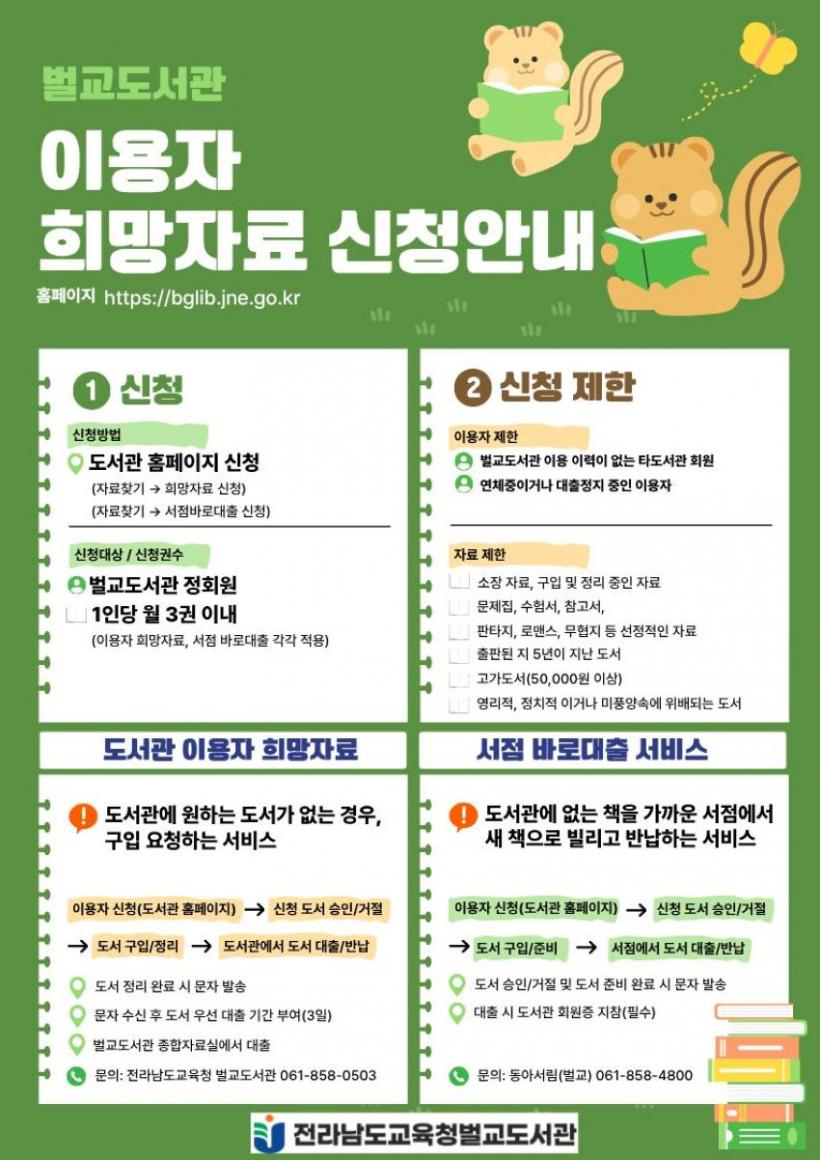 ¡®ÀÌ¿ëÀÚ Èñ¸ÁÀÚ·á ¼ºñ½º¡¯´Â µµ¼°ü¿¡ ¼ÒÀåµÇ¾î ÀÖÁö ¾ÊÀº µµ¼¸¦ ÀÌ¿ëÀÚ°¡ Á÷Á¢ ½ÅûÇϸé, µµ¼°ü¿¡¼ ÇØ´ç ÀڷḦ ±¸ÀÔ¡¤Á¤¸®ÇÑ ÈÄ ´ëÃâÇØ ÁÖ´Â ¼ºñ½º´Ù. ½ÅûÀº ¹ú±³µµ¼°ü ´©¸®Áý(https://bglib.jne.go.kr)À» ÅëÇØ °¡´ÉÇϸç, ¹ú±³µµ¼°ü Á¤È¸¿ø 1ÀÎ´ç ¿ù 3±Ç À̳»·Î ½ÅûÇÒ ¼ö ÀÖ´Ù.