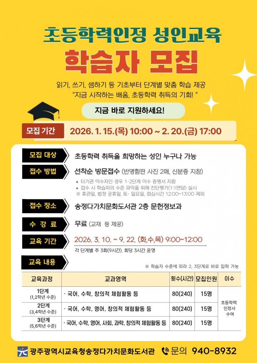 [°ø°£´º½º = ±è¼ö±Ù±âÀÚ] ±¤Áֽñ³À°Ã»¼ÛÁ¤´Ù°¡Ä¡¹®Èµµ¼°ü(ÀÌÇÏ ¼ÛÁ¤´Ù°¡Ä¡¹®Èµµ¼°ü)Àº ¡®2026Çг⵵ ÃʵîÇзÂÀÎÁ¤ ¼ºÀα³À°¡¯ ÇÁ·Î±×·¥À» ¿î¿µÇÑ´Ù.