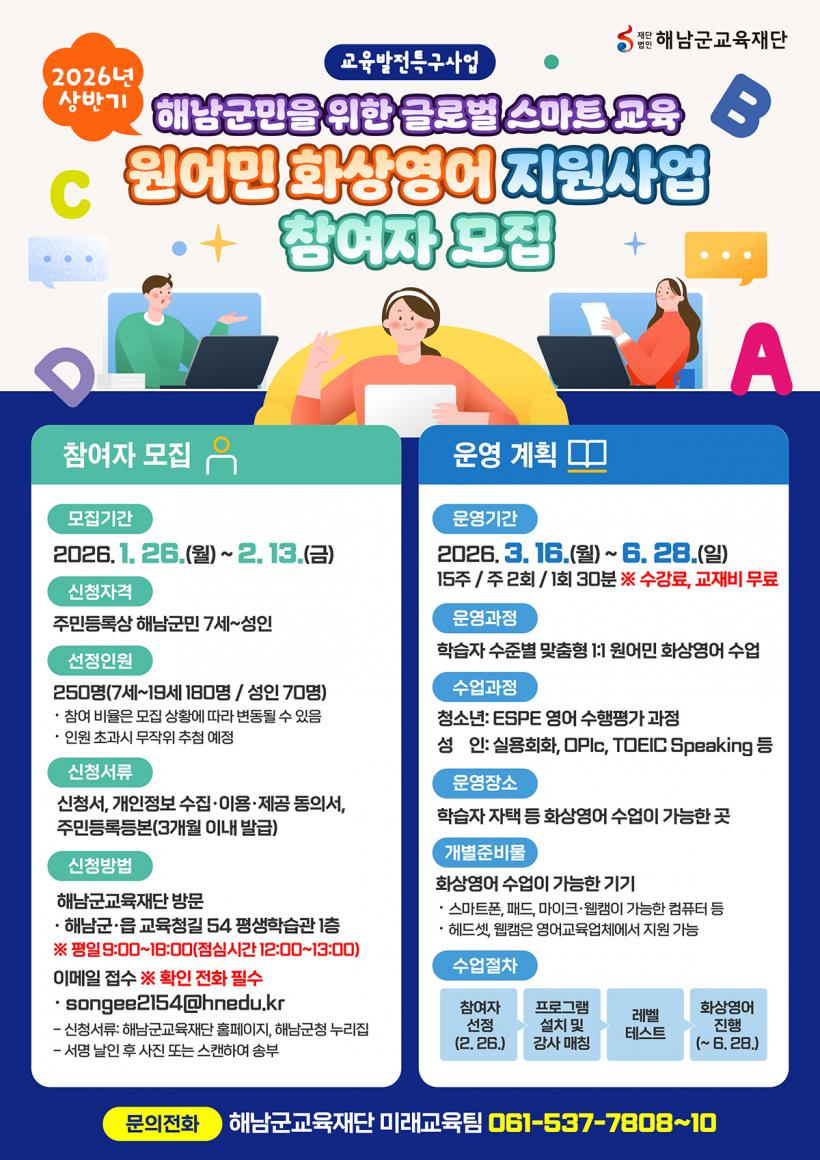 [°ø°£´º½º = Çѵ¿¼ø±âÀÚ] Àç´Ü¹ýÀÎ ÇØ³²±º±³À°Àç´Ü(ÀÌ»çÀå ¸íÇö°ü)Àº »ó¹Ý±â ¿ø¾î¹Î Ȼ󿵾î Áö¿ø»ç¾÷ÀÇ Âü¿©ÀÚ¸¦ ¸ðÁýÇÑ´Ù.