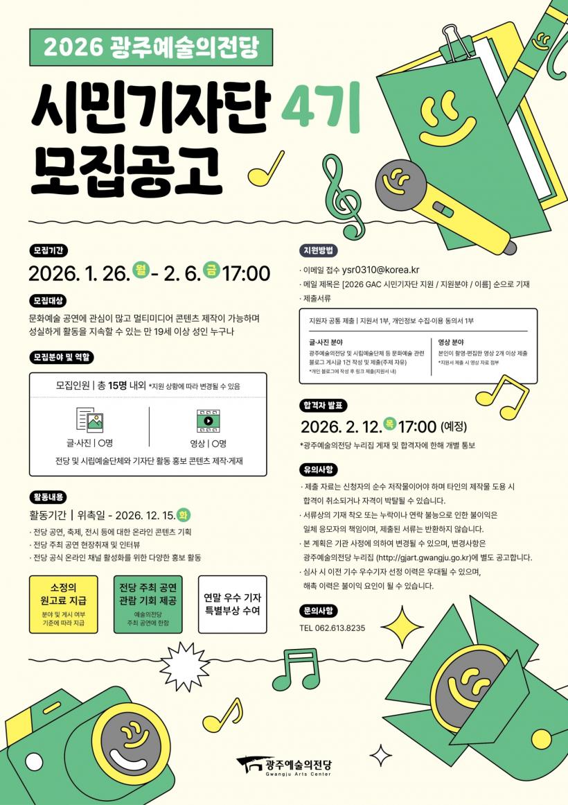 [°ø°£´º½º = ±è¼ö±Ù±âÀÚ] ±¤ÁÖ±¤¿ª½Ã ¿¹¼úÀÇÀü´çÀº Àü´çÀÇ ´Ù¾çÇÑ °ø¿¬ Á¤º¸¿Í ¹®È ¼Ò½ÄÀ» Á÷Á¢ ÃëÀçÇÏ°í °ø½Ä ¿Â¶óÀΠä³ÎÀ» ÅëÇØ ¾Ë¸± ¡®2026 ±¤ÁÖ¿¹¼úÀÇÀü´ç ½Ã¹Î±âÀÚ´Ü 4±â¡¯¸¦ 26ÀϺÎÅÍ 2¿ù6ÀϱîÁö ¸ðÁýÇÑ´Ù.