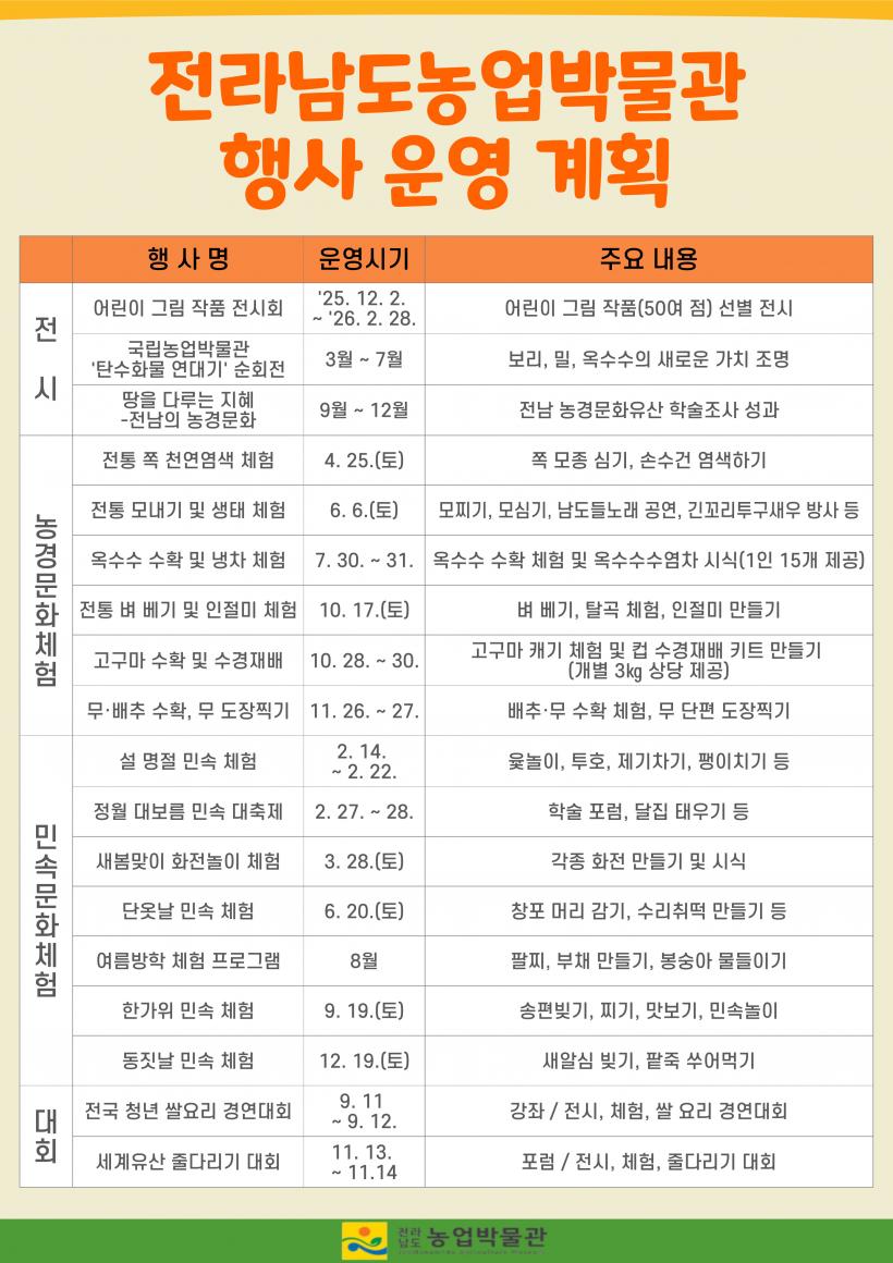µµ¹Î ¿¸° Âü¿© °ø°£ Á¦°øÀ» À§ÇØ ³ó°æ üÇèÇà»ç(6Á¾), ¹Î¼Ó üÇèÇà»ç(7Á¾), ÁÖ¸» ³óºÎÀåÅÍ, Àü±¹ ´ÜÀ§ °æ¿¬´ëȸ(2Á¾) µî ÄÜÅÙÃ÷µµ ¿î¿µÇÑ´Ù. ³ó°æ¹®È ÀÌÇØ¿Í ÀüÅë¹®È º¸Á¸ Àü½ÂÀ» À§ÇÑ ³ó°¡ ¿ù·Éº° ³ó°æ¡¤¹Î¼Ó üÇèÀº ¼³ ¸íÀý(1¿ù), Á¤¿ù ´ëº¸¸§(2¿ù), ÈÀü³îÀÌ(3¿ù), õ¿¬¿°»ö(4¿ù), ´Ü¿À(5¿ù), ÀüÅë ¸ð³»±â(6¿ù), ¿©¸§¹æÇРüÇè(7~8¿ù), ¿Á¼ö¼ö ¼öÈ®(9¿ù), ÇѰ¡À§¡¤º¡¤°í±¸¸¶ ¼öÈ®(10¿ù), ¹«¡¤¹èÃß ¼öÈ®(11¿ù), µ¿Áþ³¯ ¹Î¼Ó üÇè(12¿ù) µîÀÌ´Ù.