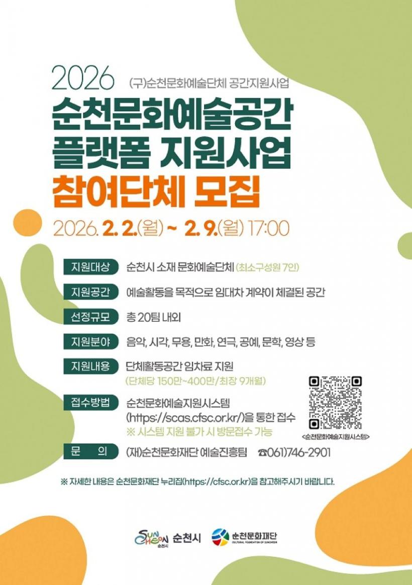 [°ø°£´º½º = ±è¿ëÁø±âÀÚ] (Àç)¼øÃµ¹®ÈÀç´ÜÀº ¿À´Â 2¿ù 2ÀϺÎÅÍ 9ÀϱîÁö Áö¿ª ¹®È¿¹¼ú´ÜüÀÇ ¾ÈÁ¤ÀûÀΠȰµ¿ ±â¹ÝÀ» ¸¶·ÃÇϰí, ¹®È¿¹¼ú °ø°£À» Áö¿ª ¹®È¿¹¼ú »ýŰèÀÇ °ÅÁ¡À¸·Î À°¼ºÇϱâ À§ÇØ ¡®2026 ¼øÃµ¹®È¿¹¼ú°ø°£ Ç÷§Æû Áö¿ø»ç¾÷¡¯¿¡ Âü¿©ÇÒ ¹®È¿¹¼ú´Üü¸¦ ¸ðÁýÇÑ´Ù.