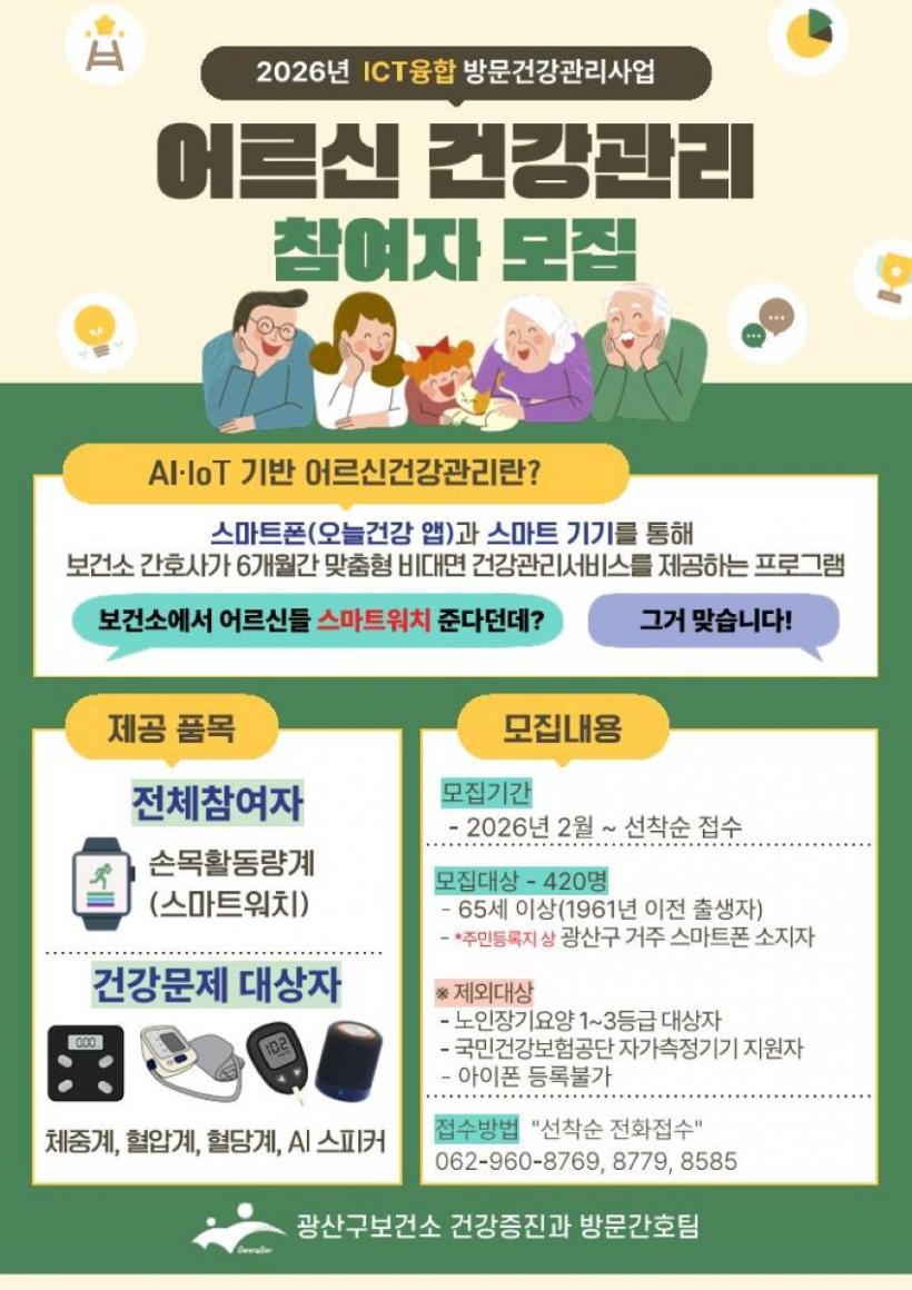 [°ø°£´º½º = ±è´ë¿µ±âÀÚ] ±¤ÁÖ ±¤»ê±¸°¡ 65¼¼ ÀÌ»ó ¾î¸£½ÅÀ» ´ë»óÀ¸·Î ÀΰøÁö´É(AI)¡¤»ç¹°ÀÎÅͳÝ(IoT) ±â¹Ý ¾î¸£½Å °Ç°°ü¸® »ç¾÷ ½Å±Ô Âü¿©ÀÚ 420¸íÀ» ¼±Âø¼ø ¸ðÁýÇÑ´Ù.