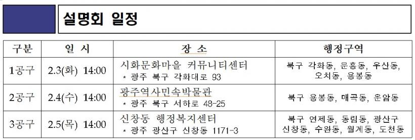 ½Ã¹Î ¼³¸íȸ´Â 2¿ù3ÀÏ ¿ÀÈÄ 2½Ã ½Ãȹ®È¸¶À» Ä¿¹Â´ÏƼ¼¾Å͸¦ ½ÃÀÛÀ¸·Î, 2¿ù4ÀÏ ¿ÀÈÄ 2½Ã ±¤ÁÖ¿ª»ç¹Î¼Ó¹Ú¹°°ü, 2¿ù5ÀÏ ¿ÀÈÄ 2½Ã ½Å⵿ ÇàÁ¤º¹Áö¼¾ÅÍ µî °ø»ç ±¸°£ Àα٠Áö¿ªÀ» Áß½ÉÀ¸·Î ÃÑ 3Â÷·Ê ¿¸°´Ù.