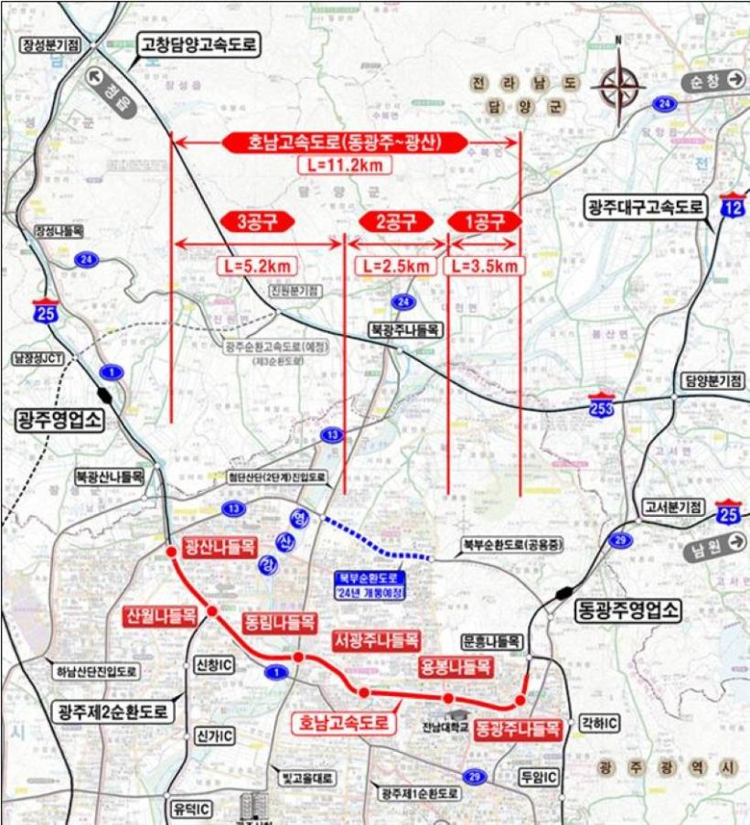 È£³²°í¼Óµµ·Î È®Àå°ø»ç´Â ÃÑ 7934¾ï¿øÀ» ÅõÀÔÇØ µ¿±¤ÁÖICºÎÅÍ ±¤»êIC±îÁö ÃÑ 11.2§° ±¸°£À» ±âÁ¸ ¿Õº¹ 4Â÷·Î¿¡¼ 6Â÷·Î·Î È®ÀåÇÏ´Â ´ë±Ô¸ð µµ·Î ±â¹Ý½Ã¼³ °³¼± »ç¾÷ÀÌ´Ù. ÀÌ ±¸°£¿¡´Â ¡ãµ¿±¤ÁÖIC ¡ã¿ëºÀIC ¡ã¼±¤ÁÖIC ¡ãµ¿¸²IC ¡ã»ê¿ùIC ¡ã±¤»êIC°¡ Æ÷ÇԵǸç, °ø»ç´Â ¿À´Â 2029³â±îÁö ´Ü°èÀûÀ¸·Î ¿Ï·áÇÒ ¿¹Á¤ÀÌ´Ù.