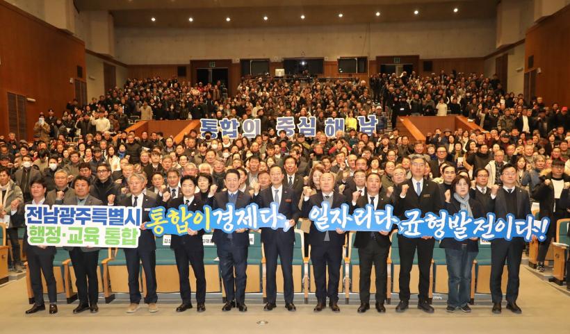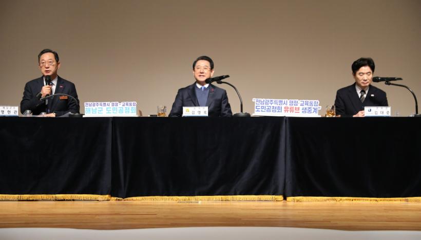 ÇÑÆí 29ÀÏ ÇØ³²¹®È¿¹¼úȸ°ü¿¡¼´Â Àü³²¡¤±¤ÁÖ ÇàÁ¤ÅëÇÕ µµ¹Î °øÃ»È¸°¡ ¿·È´Ù. 700¿©¸íÀÇ ±º¹ÎµéÀÌ °¡µæÂù °¡¿îµ¥ ¿¸° °øÃ»È¸¿¡¼´Â ±è¿µ·Ï Àü³²µµÁö»ç¿Í ±è´ëÁß Àü³²±³À°°¨ÀÌ ÇàÁ¤¡¤±³À° ÅëÇÕÀÇ ÃßÁø °æ°ú¿Í ÀǹÌ, ÇâÈÄ ¹ßÀü¹æÇâ¿¡ ´ëÇØ ÇØ³²±º¹Îµé¿¡°Ô ¼³¸íÇÏ´Â ÀÚ¸®¸¦ °¡Á³´Ù.