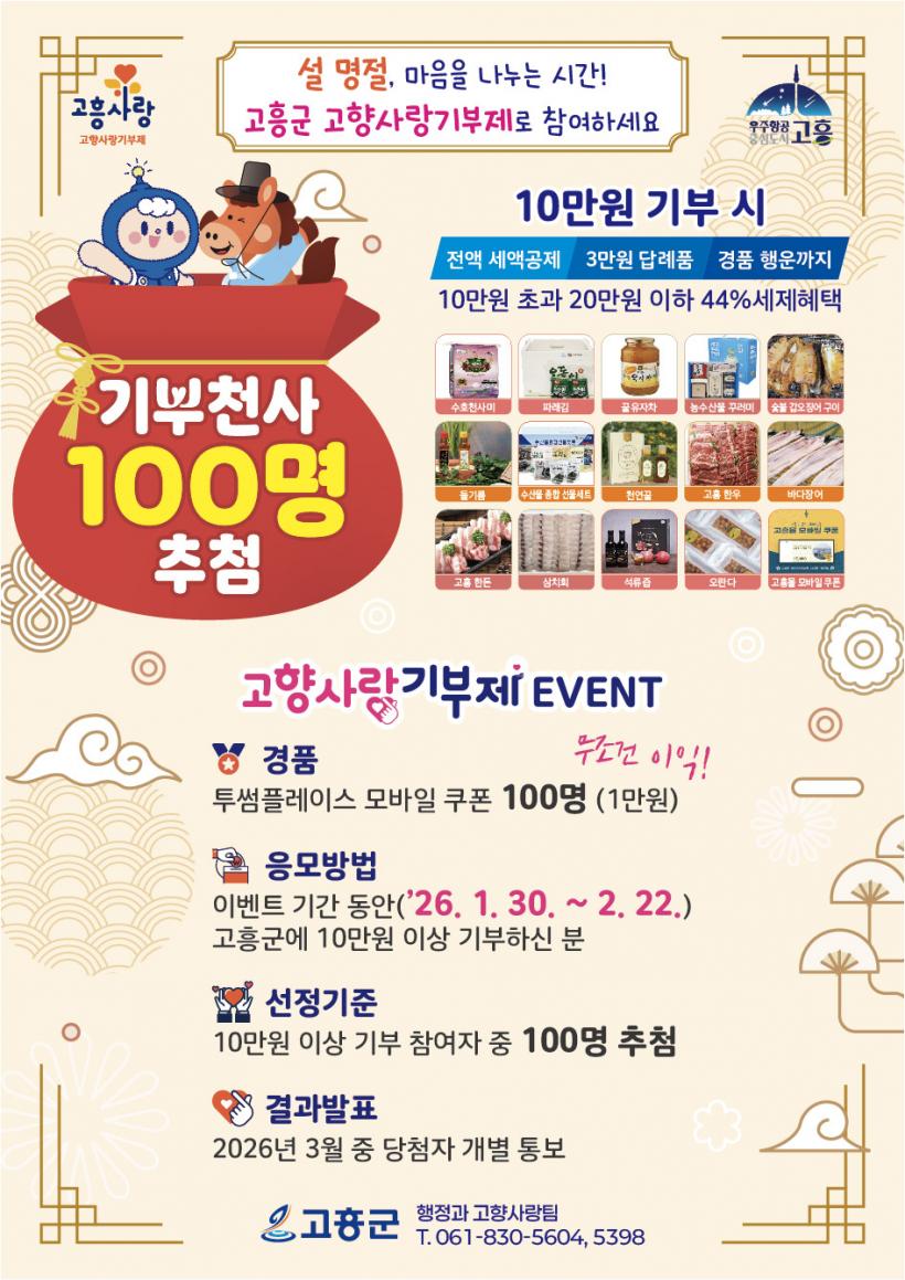 [°ø°£´º½º = ±è¿ëÁø±âÀÚ] °íÈﱺ(±º¼ö °ø¿µ¹Î)Àº 2026³â °íÇâ»ç¶û±âºÎÁ¦ ù Âü¿© Ä·ÆäÀÎÀ¸·Î, ¼³ ¸íÀýÀ» ¸Â¾Æ 1¿ù 30ÀϺÎÅÍ 2¿ù 22ÀϱîÁö ¡®¼³¸ÂÀÌ °íÇâ»ç¶û±âºÎÁ¦ À̺¥Æ®¡¯¸¦ ¿î¿µÇÑ´Ù°í ¹àÇû´Ù.