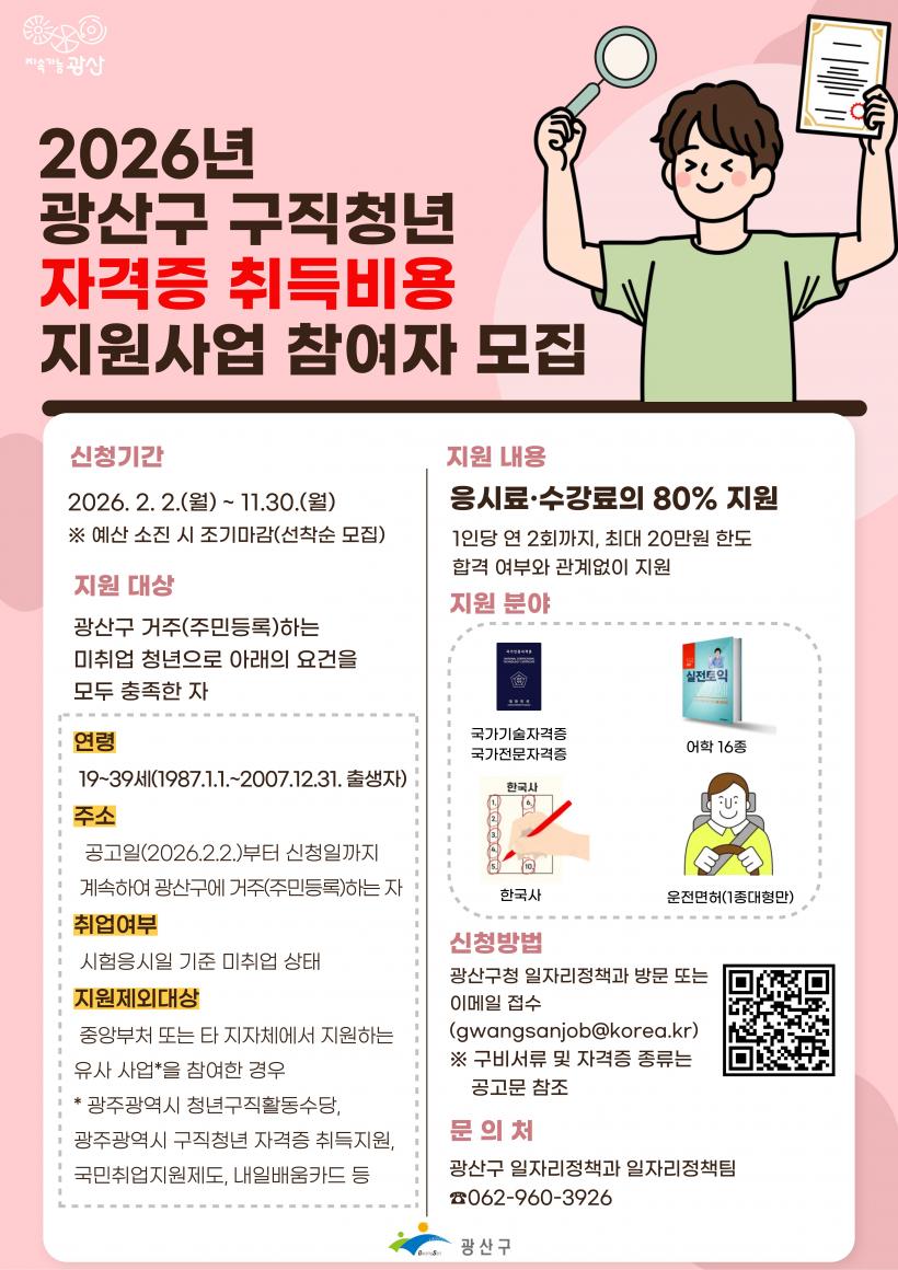 ±¤»ê±¸¿¡ ÁÖ¼Ò¸¦ µÎ°í °ÅÁÖÇÏ´Â 19¼¼~39¼¼(1987³â~2007³â»ý) ¹ÌÃë¾÷ û³âÀ» ´ë»óÀ¸·Î, ÀÚ°ÝÁõ Ãëµæ¿¡ ÇÊ¿äÇÑ ½ÃÇè ÀÀ½Ã·á¿Í ¼ö°·á¸¦ Áö¿øÇÏ´Â »ç¾÷ÀÌ´Ù.
