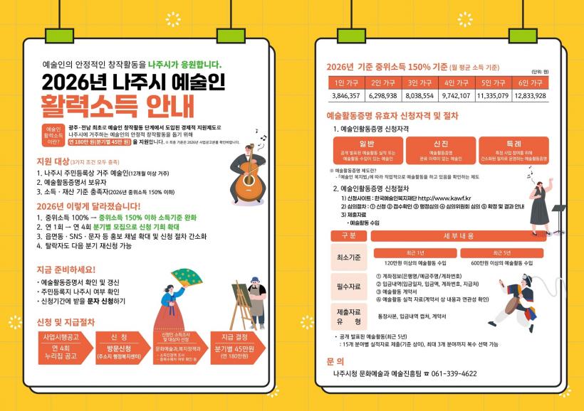 [°ø°£´º½º = ¹Ú¼º¿Á±âÀÚ] Àü¶ó³²µµ ³ªÁֽð¡ Áö¿ª ¿¹¼úÀÎÀÇ ¾ÈÁ¤ÀûÀΠâÀÛ È°µ¿°ú »ýȰ ¾ÈÁ¤À» µ¿½Ã¿¡ Áö¿øÇϱâ À§ÇØ ¡®2026 ¿¹¼úÀΠȰ·Â¼Òµæ Áö¿ø±Ý¡¯ ½Åû Á¢¼ö¸¦ ½ÃÀÛÇÏ¸ç ¹®È¿¹¼ú »ýŰèÀÇ Áö¼Ó °¡´É¼ºÀ» °ÈÇÑ´Ù.