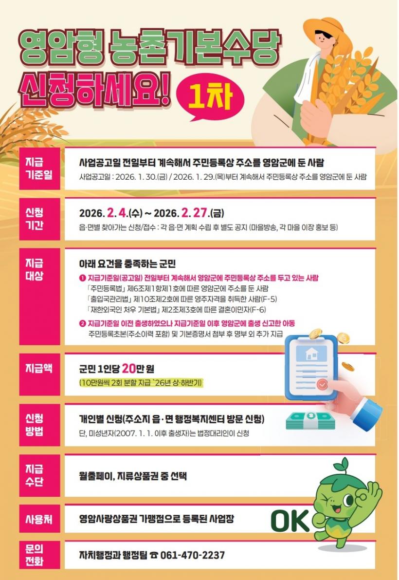 À̹ø 1Â÷ ³óÃ̱⺻¼ö´çÀº Áֹεî·Ï»ó Áö³ 1¿ù 29ÀϺÎÅÍ ¿µ¾Ï±º¹ÎÀÎ »ç¶÷¿¡°Ô 1Àδç 10¸¸¿øÀ» Áö±ÞÇϰí, °áÈ¥À̹ÎÀÚ(F-6), ¿µÁÖÀÚ°Ý ÃëµæÀÚ(F-5)µµ Æ÷ÇԵȴÙ.